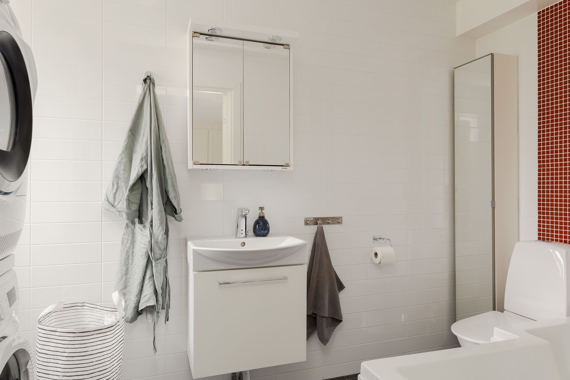 Helkaklat och rymligt badrum. Utrustningen består av wc, handfat med kommod, badkar, spegelskåp med belysning samt en tvättpelare bestående av en torktumlare och tvättmaskin. Fönster för vädrings möjlighet och naturligt ljusinsläpp.