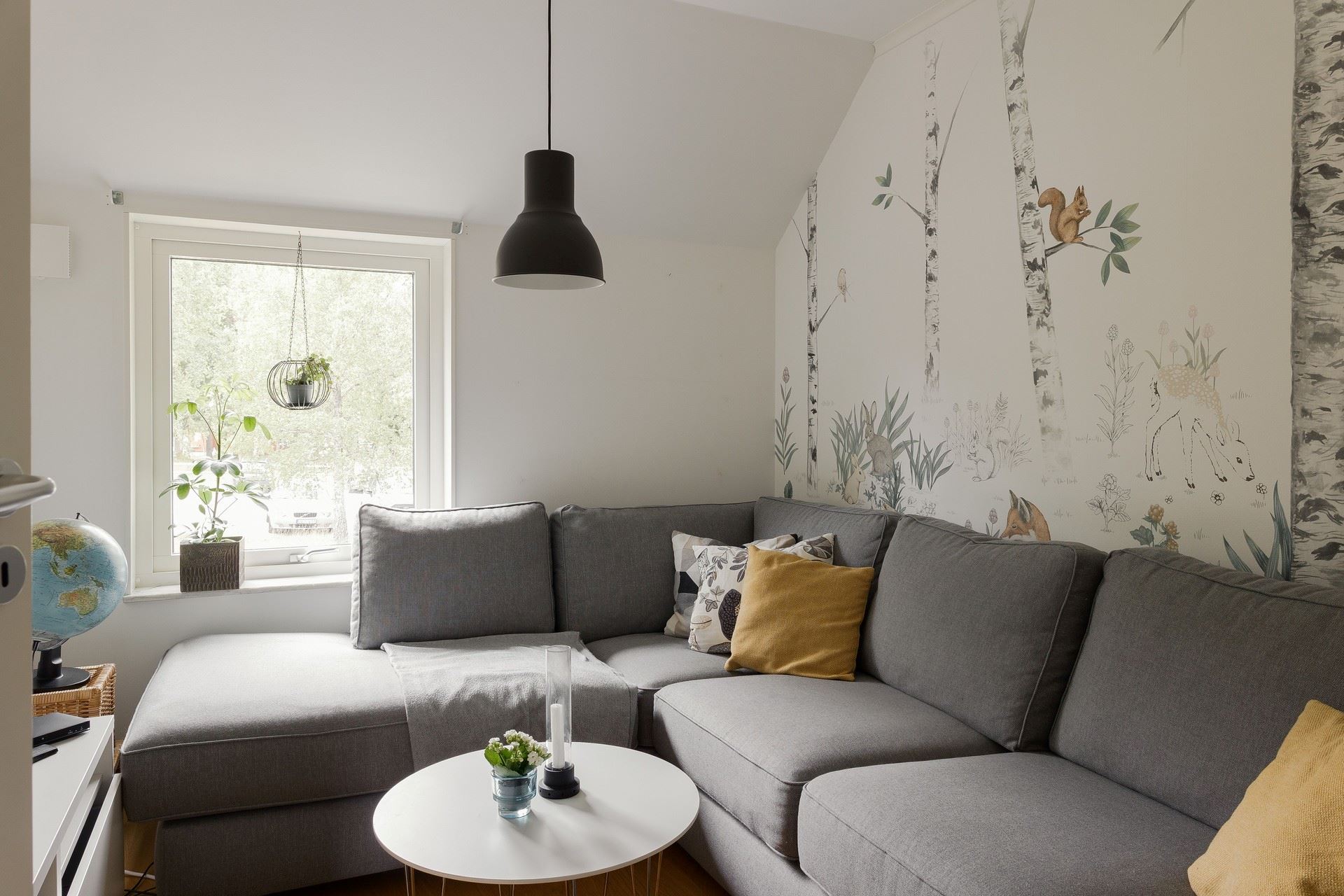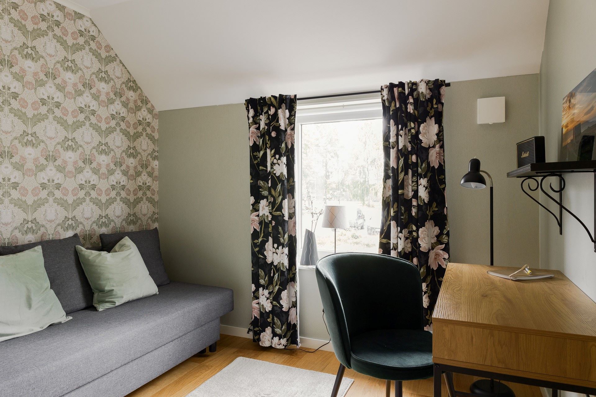 Rummets storlek passar fint till barnrum eller hemmakontor. Tapetserade väggar med ekparkett.