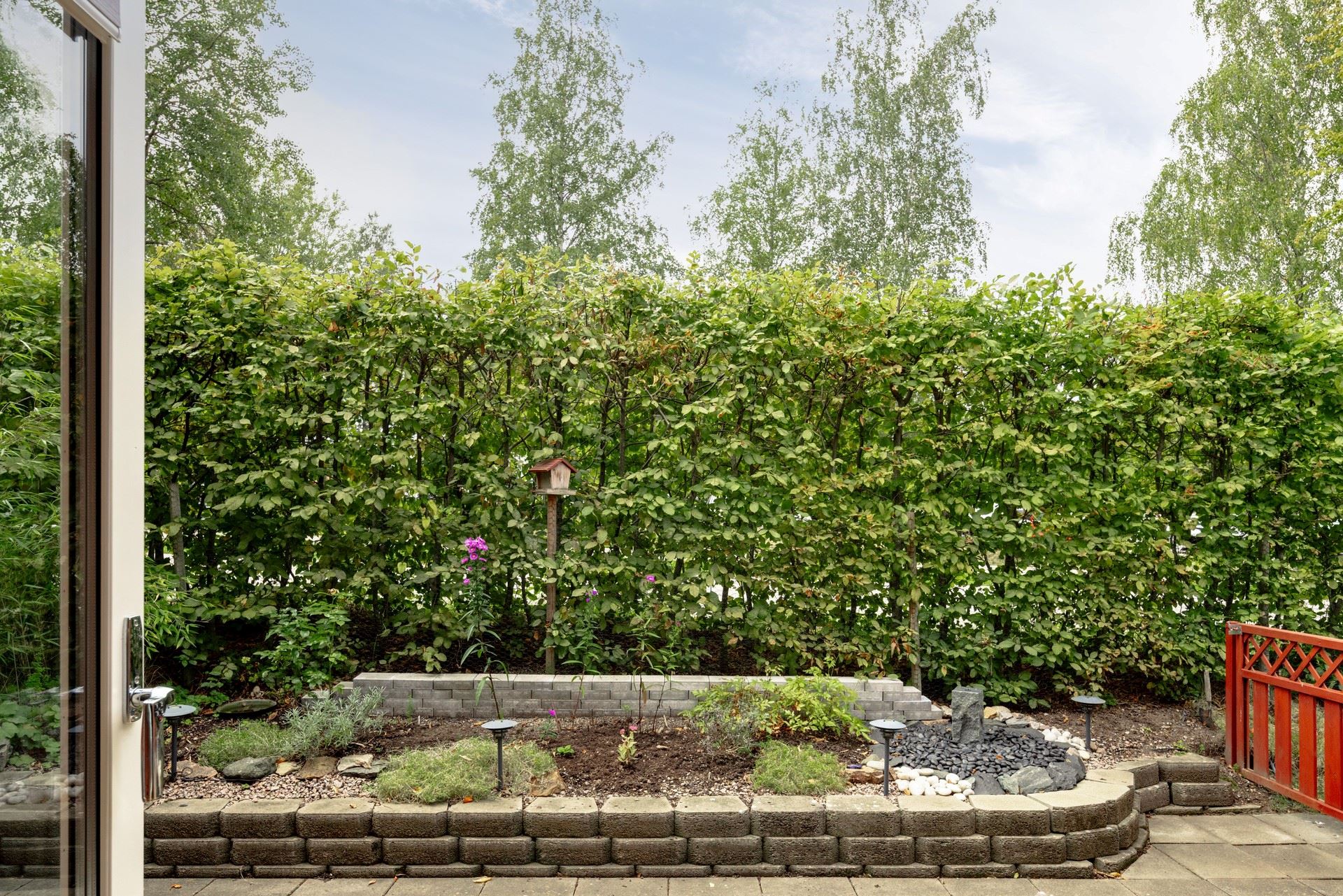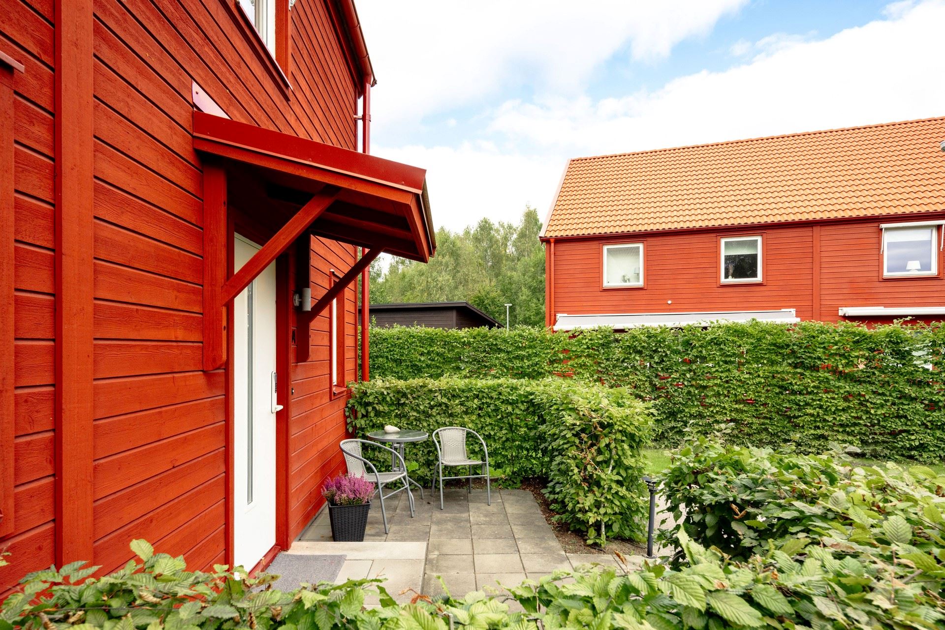 Stensatt uteplats med möjlighet till fritt förfogande till gräsytan intill. Här ges massa plats för spring och lek. Innehas med nyttjanderätt enligt styrelsen.