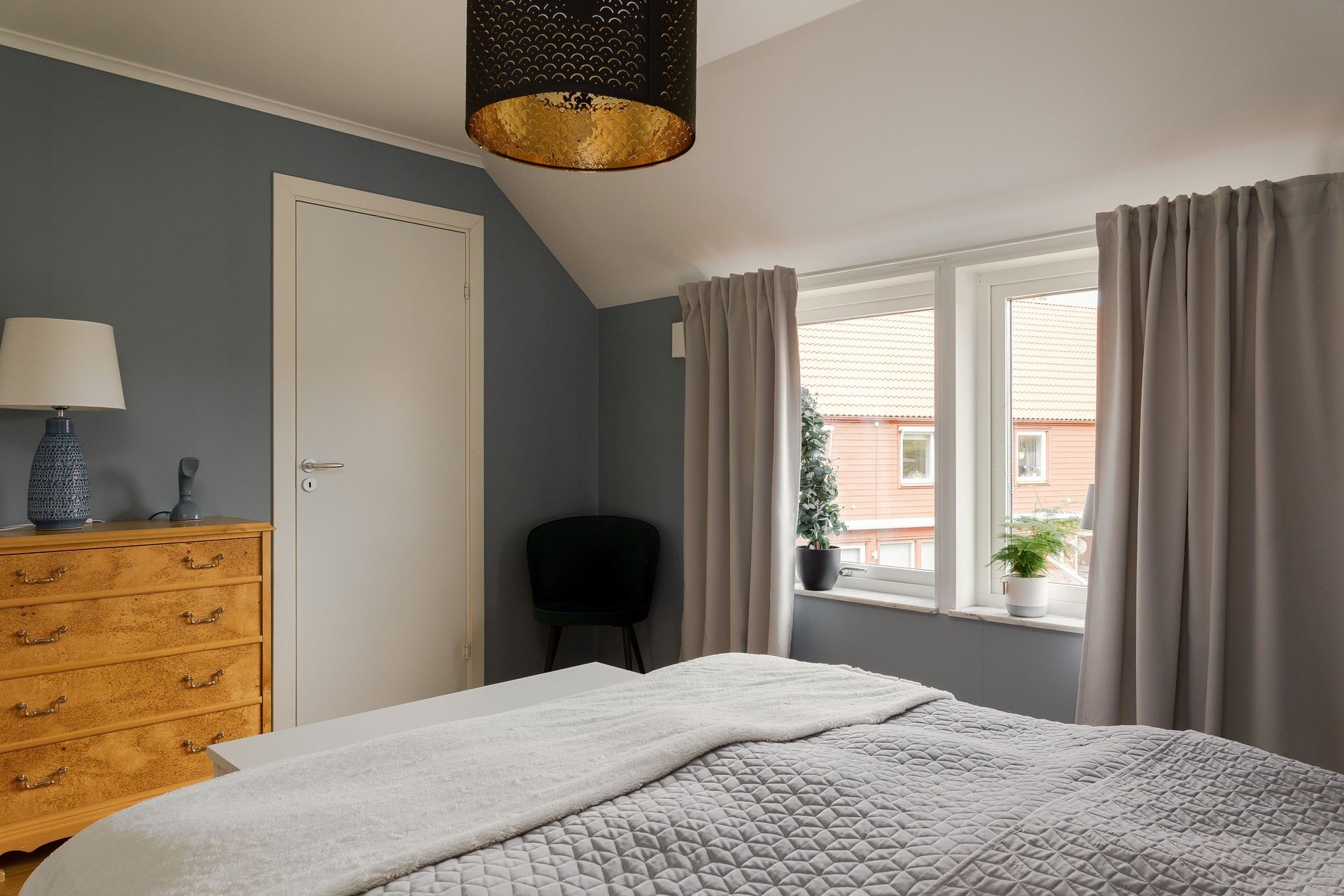 Det större sovrummet som medger plats för dubbelsäng och skrivbord. Här finns gott om förvaringslösningar i en walk in closet. Markiser finns för fönstrena att dra ner. Målade väggar med ekparkett.