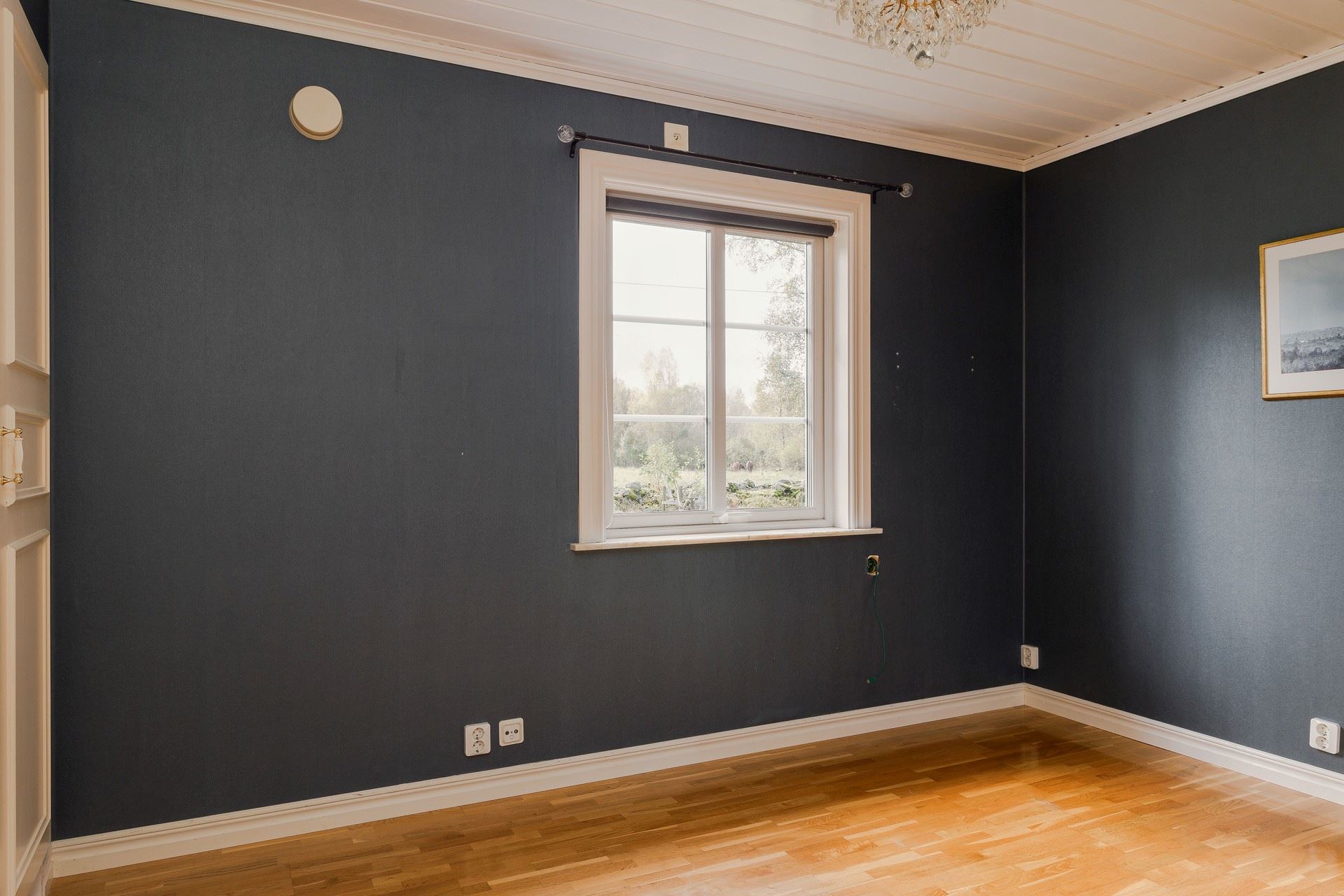 Rymligt sovrum med ekparkett och tapetserade väggar. Stora fina fönster med spröjs som vetter mot framsidan av huset ut över hästhagen.