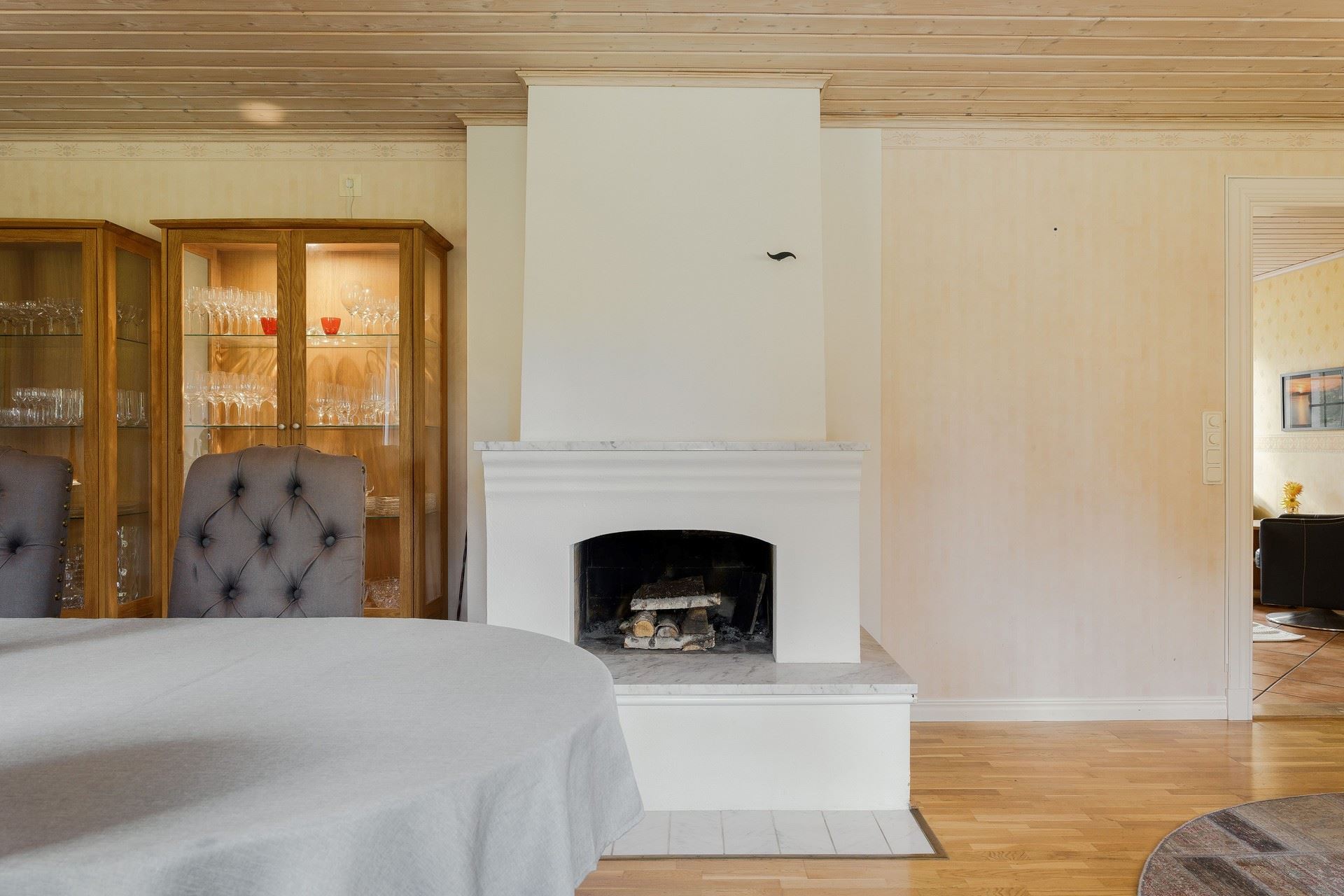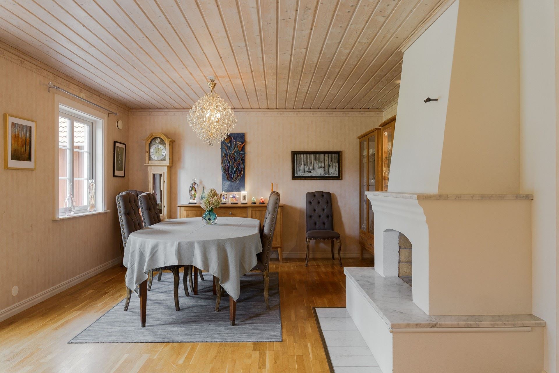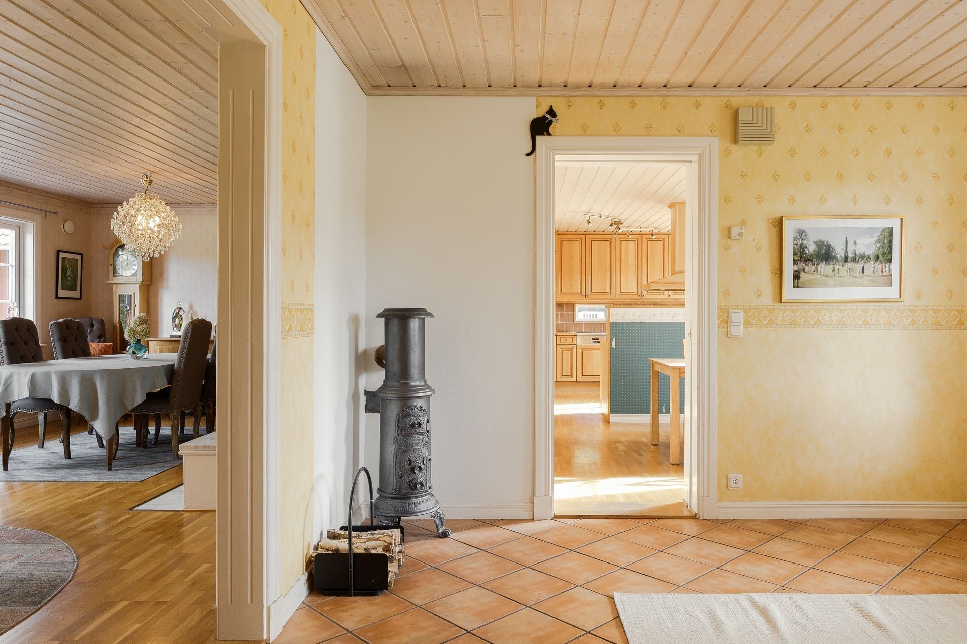 Invändigt ett av de mest älskade rummen. Här har man utgång till baksidan men man har även en naturlig koppling till framsidan genom den stora hallen och som med sitt stora ljusinsläpp från söder är navet i huset. Detta rum möjliggör både ett stort rymligt tv/sällskaps del och den stora öppna spisen är centralt placerad i rummet och får en fin övergång till matsals delen i rummet. Tapetserade väggar med ekparkett.