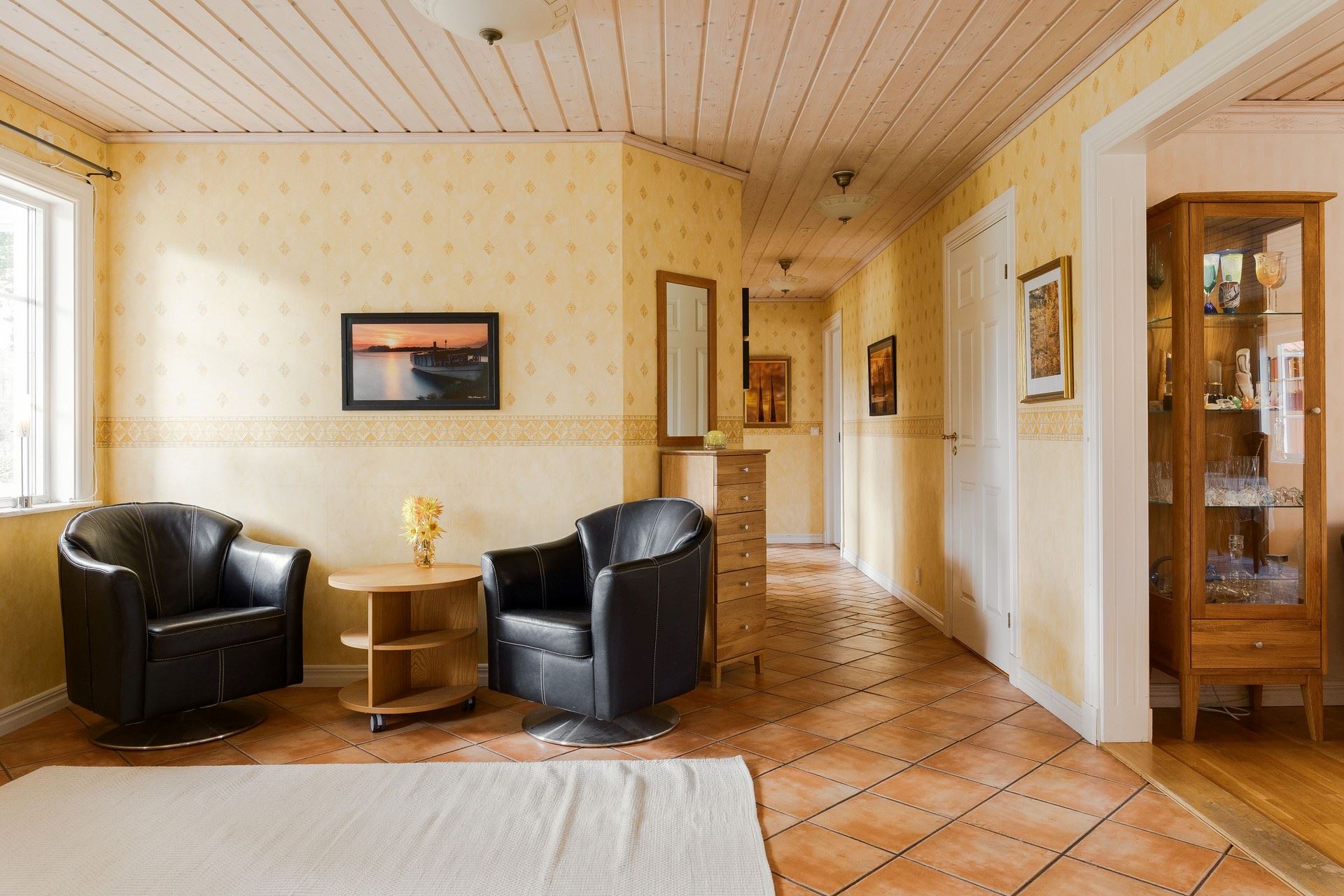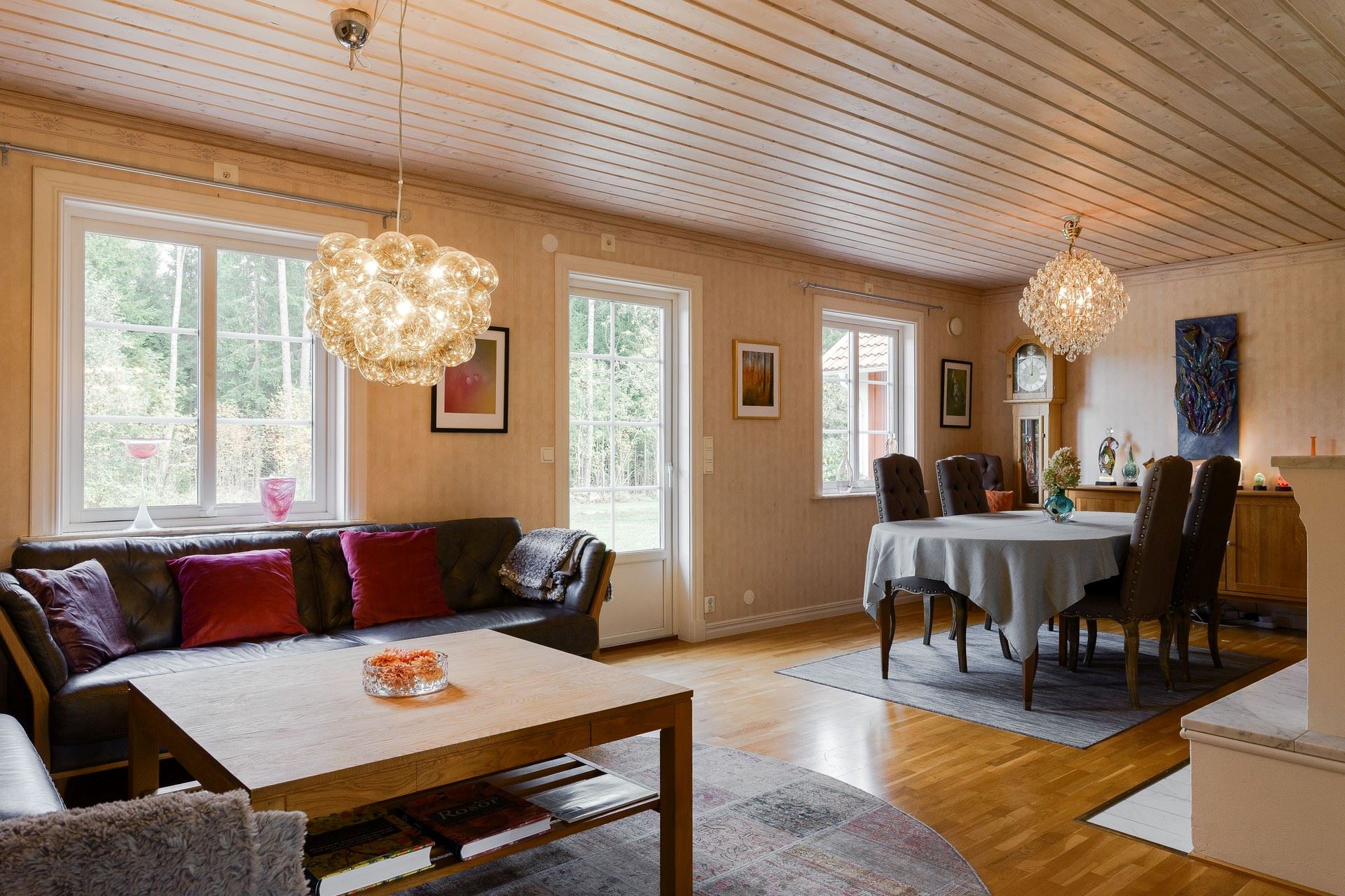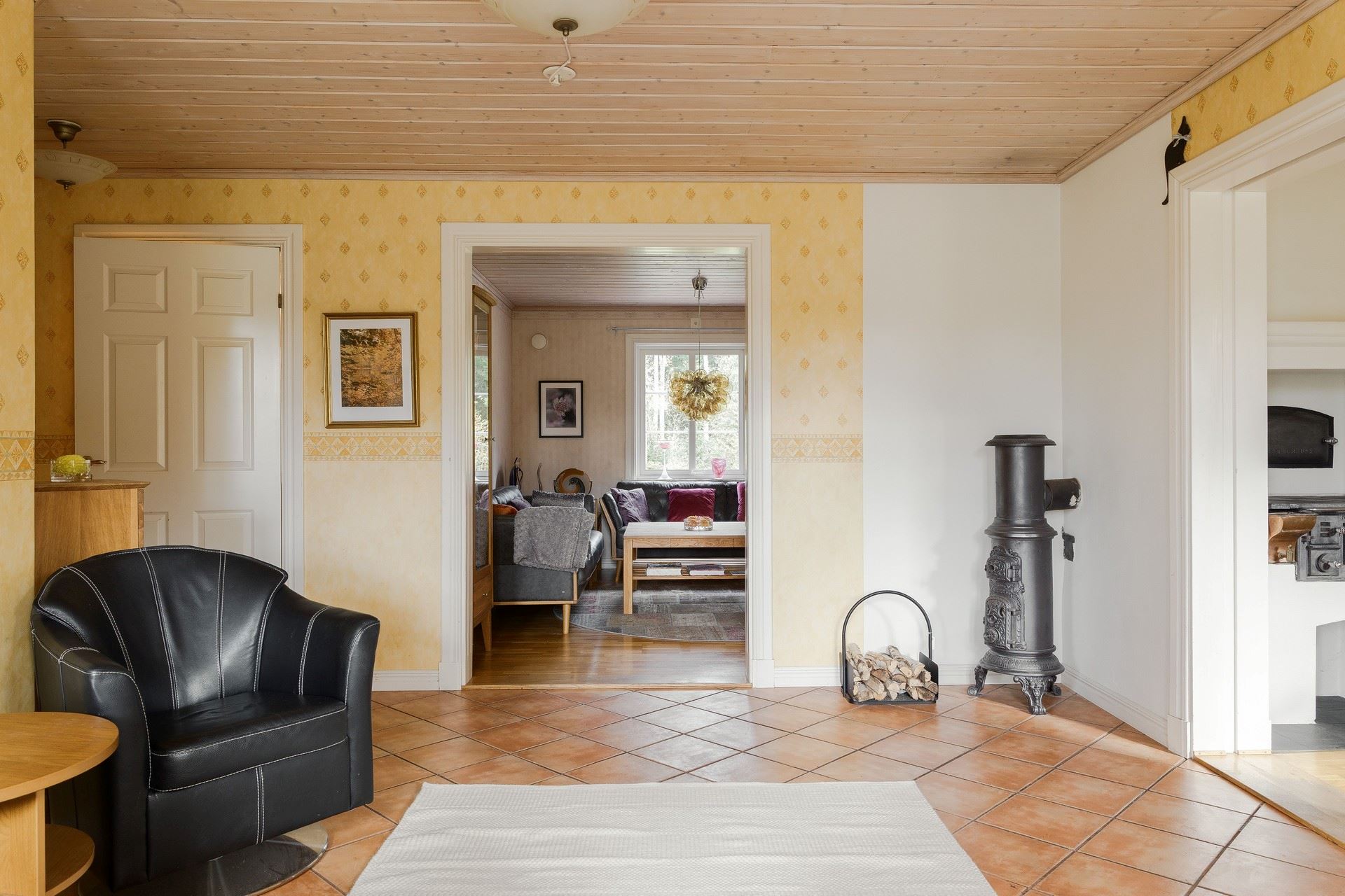 Invändigt ett av de mest älskade rummen. Här har man utgång till baksidan men man har även en naturlig koppling till framsidan genom den stora hallen och som med sitt stora ljusinsläpp från söder är navet i huset. Detta rum möjliggör både ett stort rymligt tv/sällskaps del och den stora öppna spisen är centralt placerad i rummet och får en fin övergång till matsals delen i rummet. Tapetserade väggar med ekparkett.