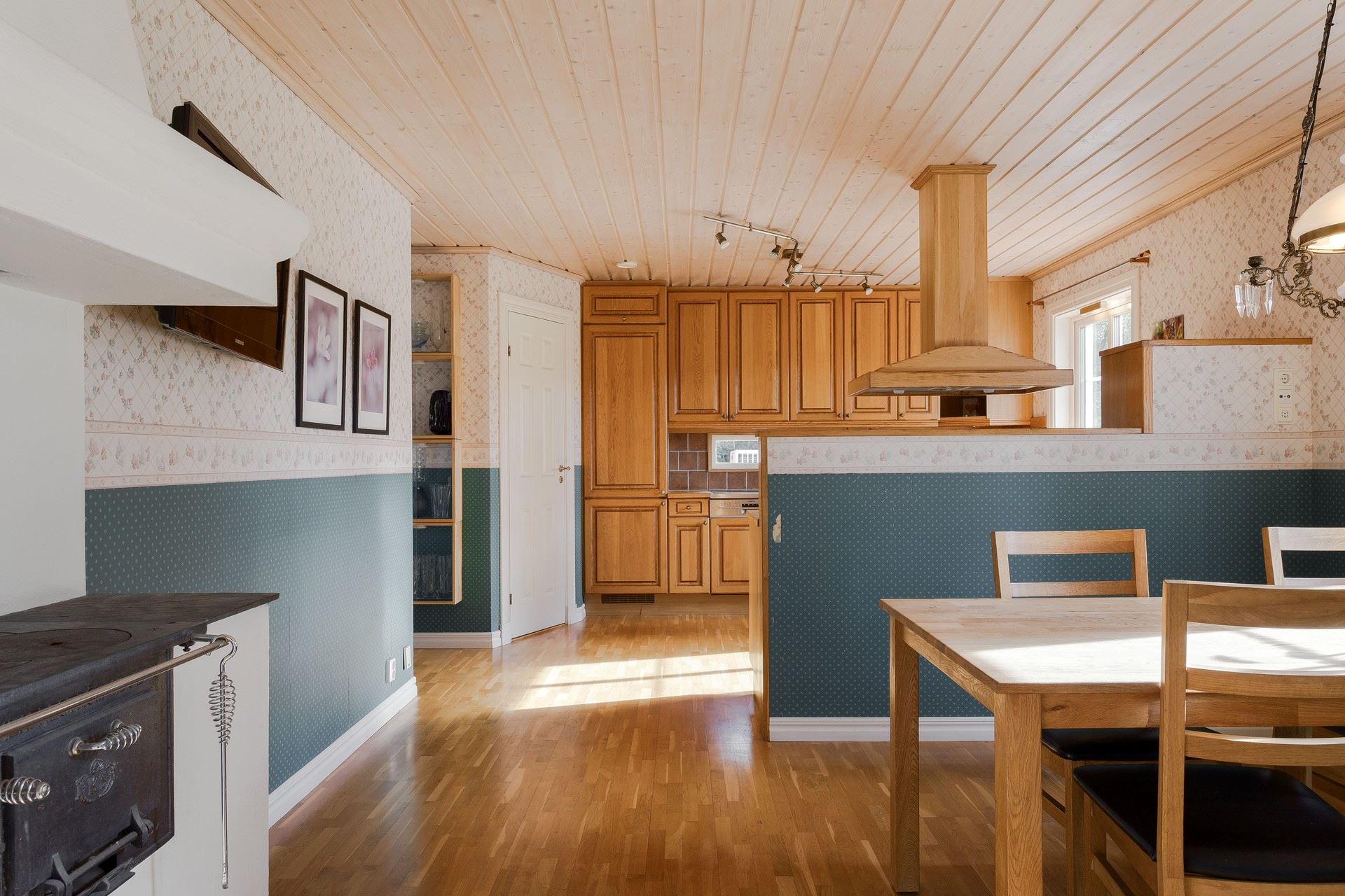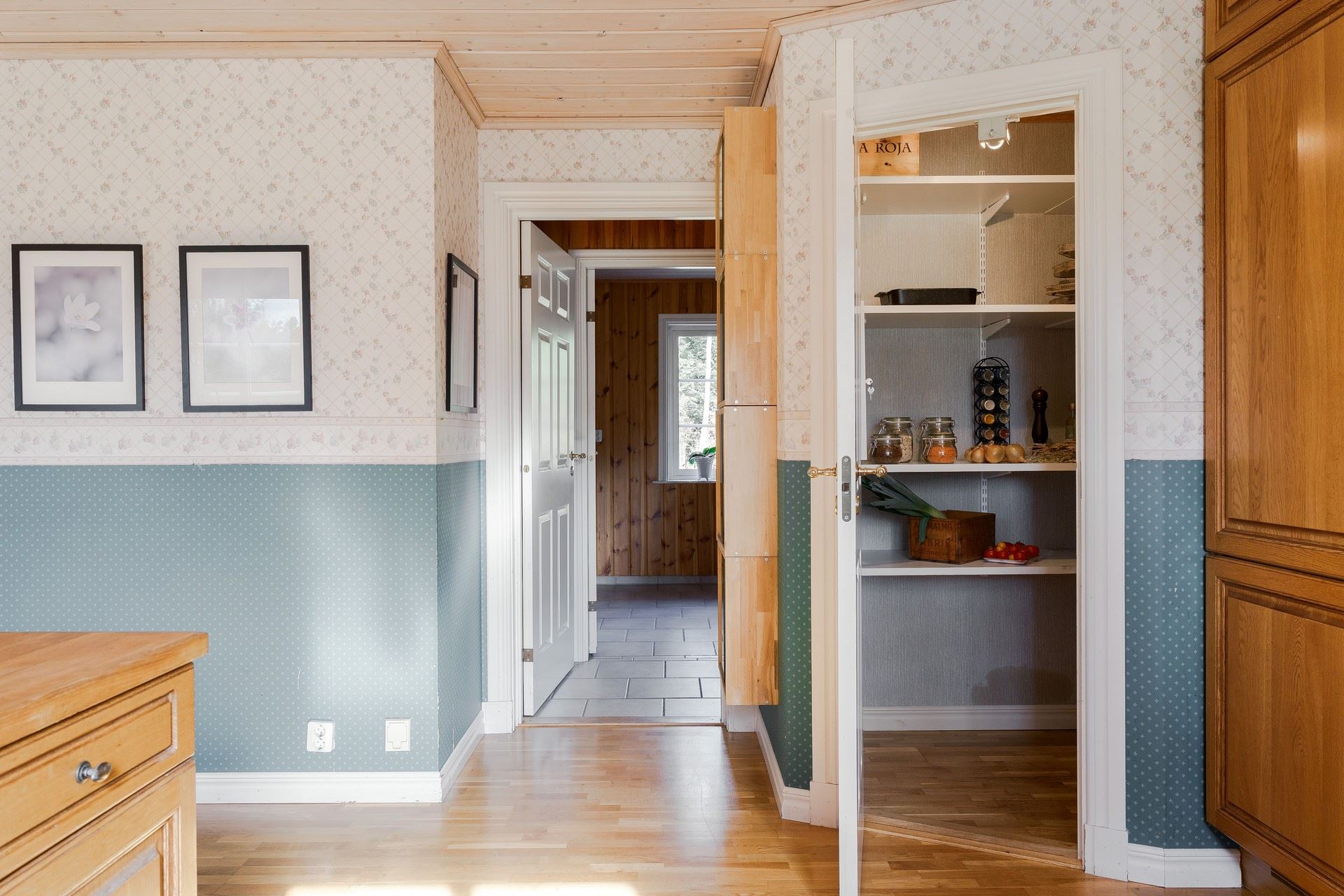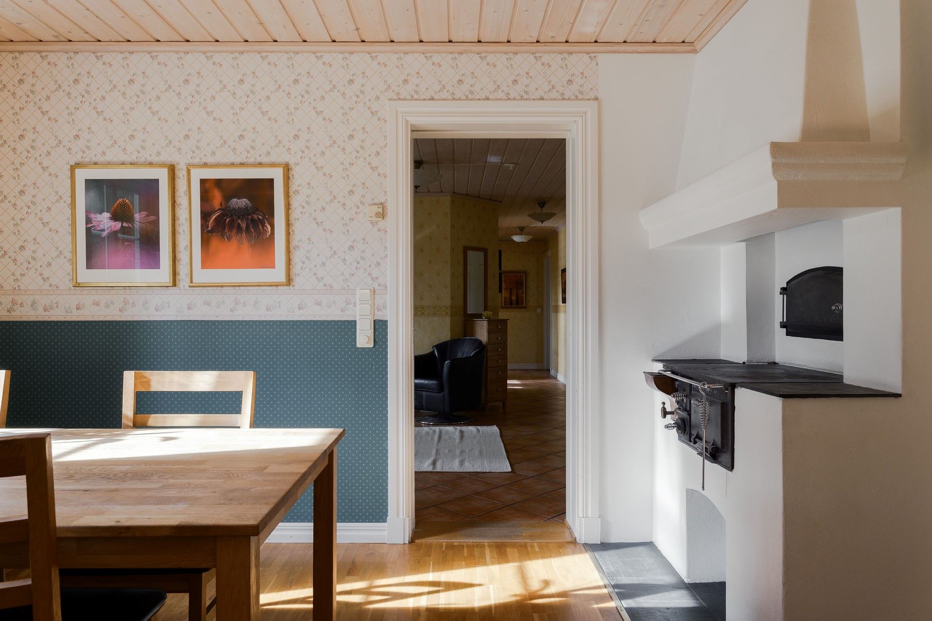 Direkt till höger från hallen når man husets kök och matplats. Här finns även en vacker äldre spis som kan generera både värme och goda middagar. Ekparkett med tapetserade väggar. Kökets luckor är i vacker patinerad ek och har fina detaljer. Massiv ek som bänkskiva, kakel satt som stänkskydd och en rejäl fläkt för den som älskar laga mat och för den inbitne matlagaren så är skafferiet oumbärlig förvaringskälla av alla torrvaror och hushållsmaskiner som kan behövas i ett kök. Flera fönsterpartier ger fint ljusinsläpp. Den maskinella utrustningen består av integrerad diskmaskin, spis med ugn, köksfläkt samt integrerad halv kyl och frys. Microvågsugn ingår ej.