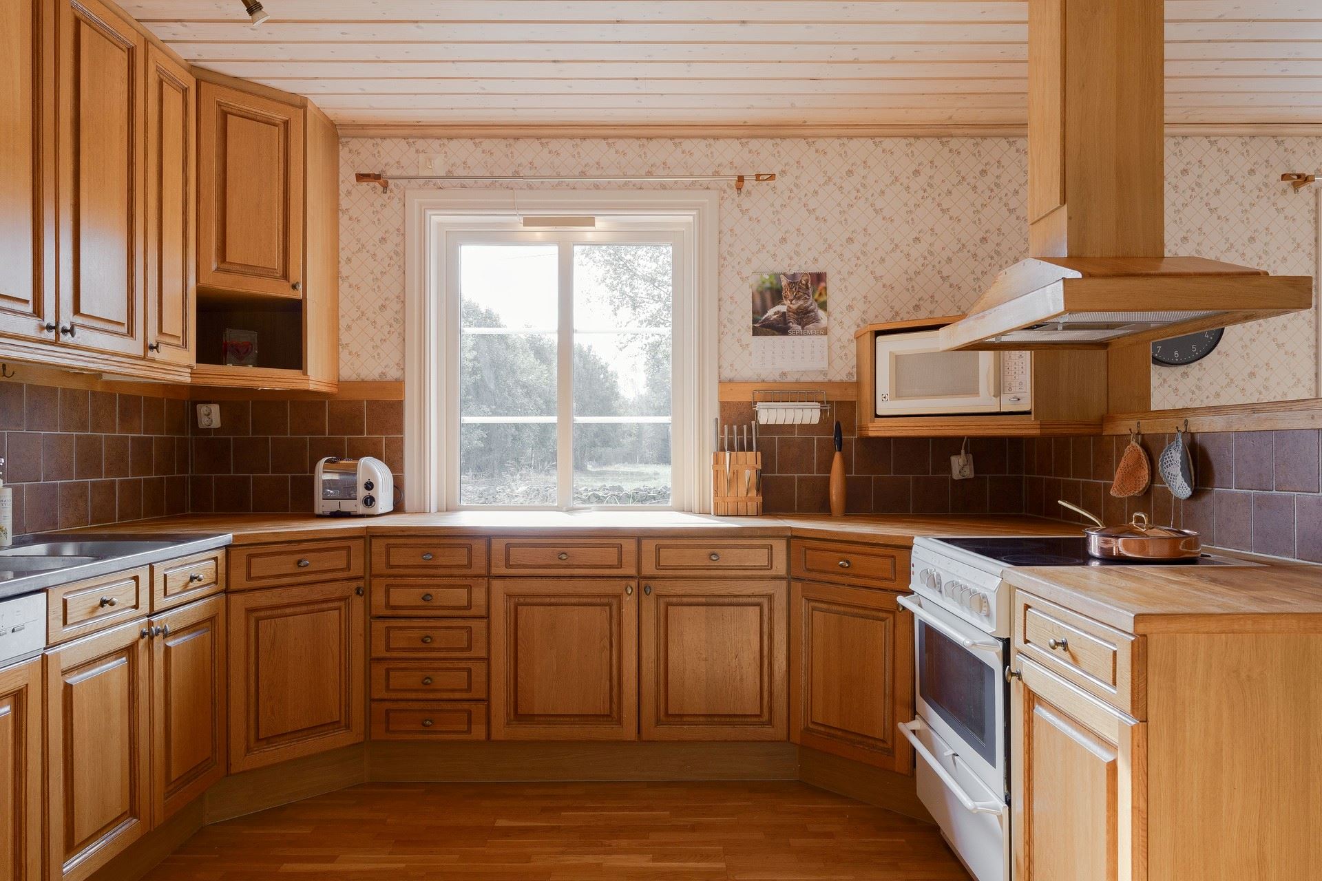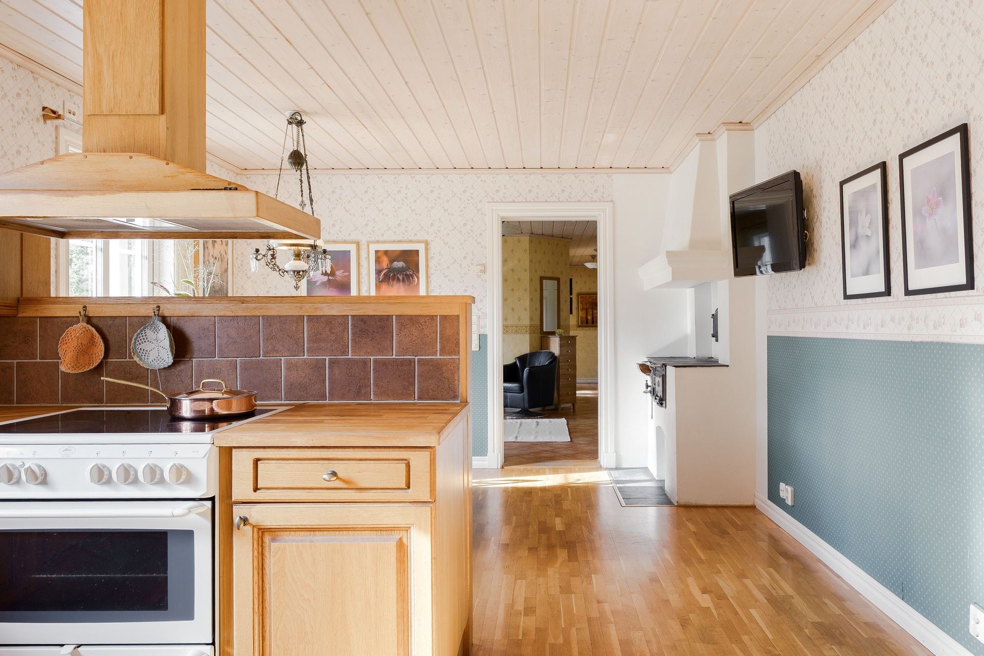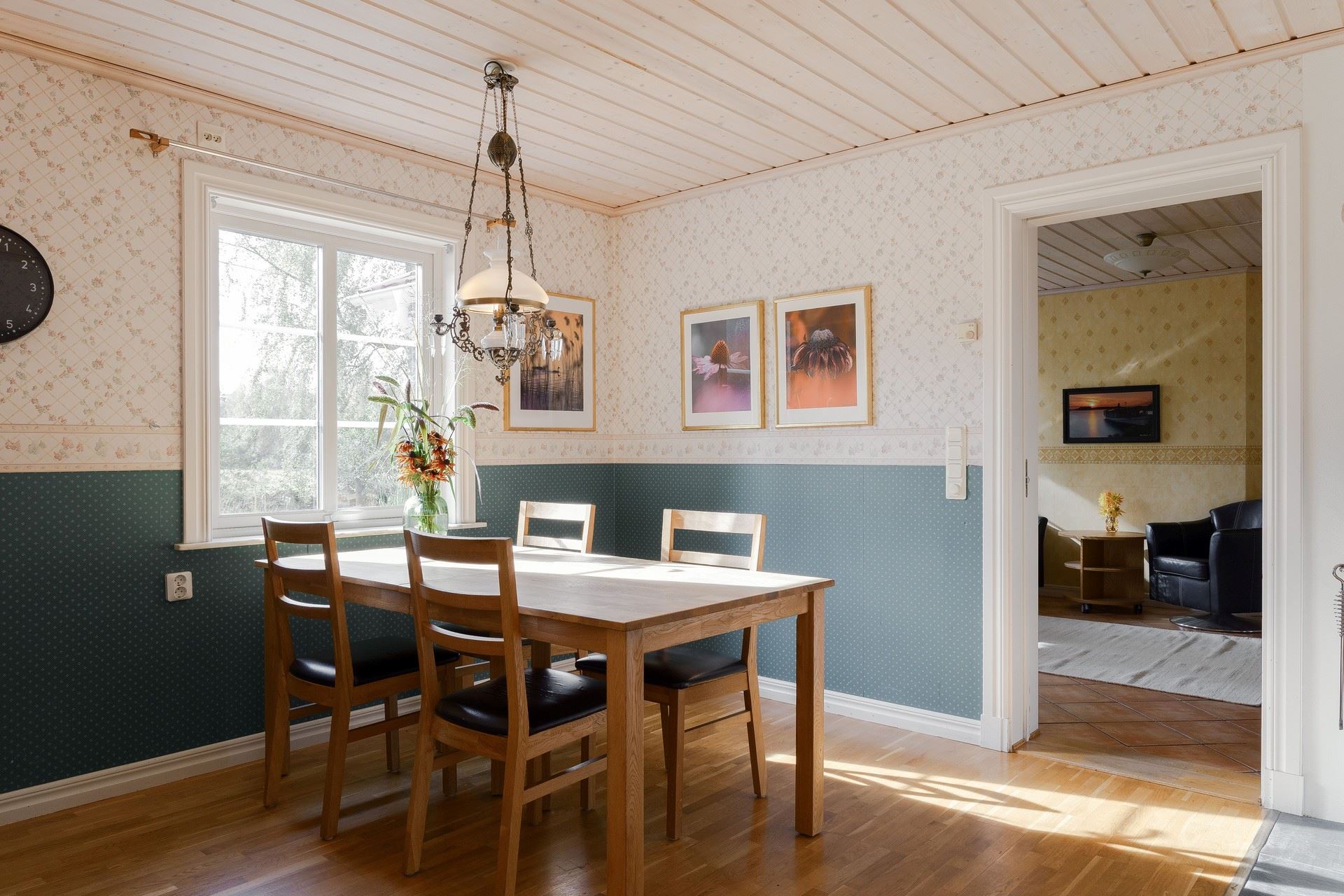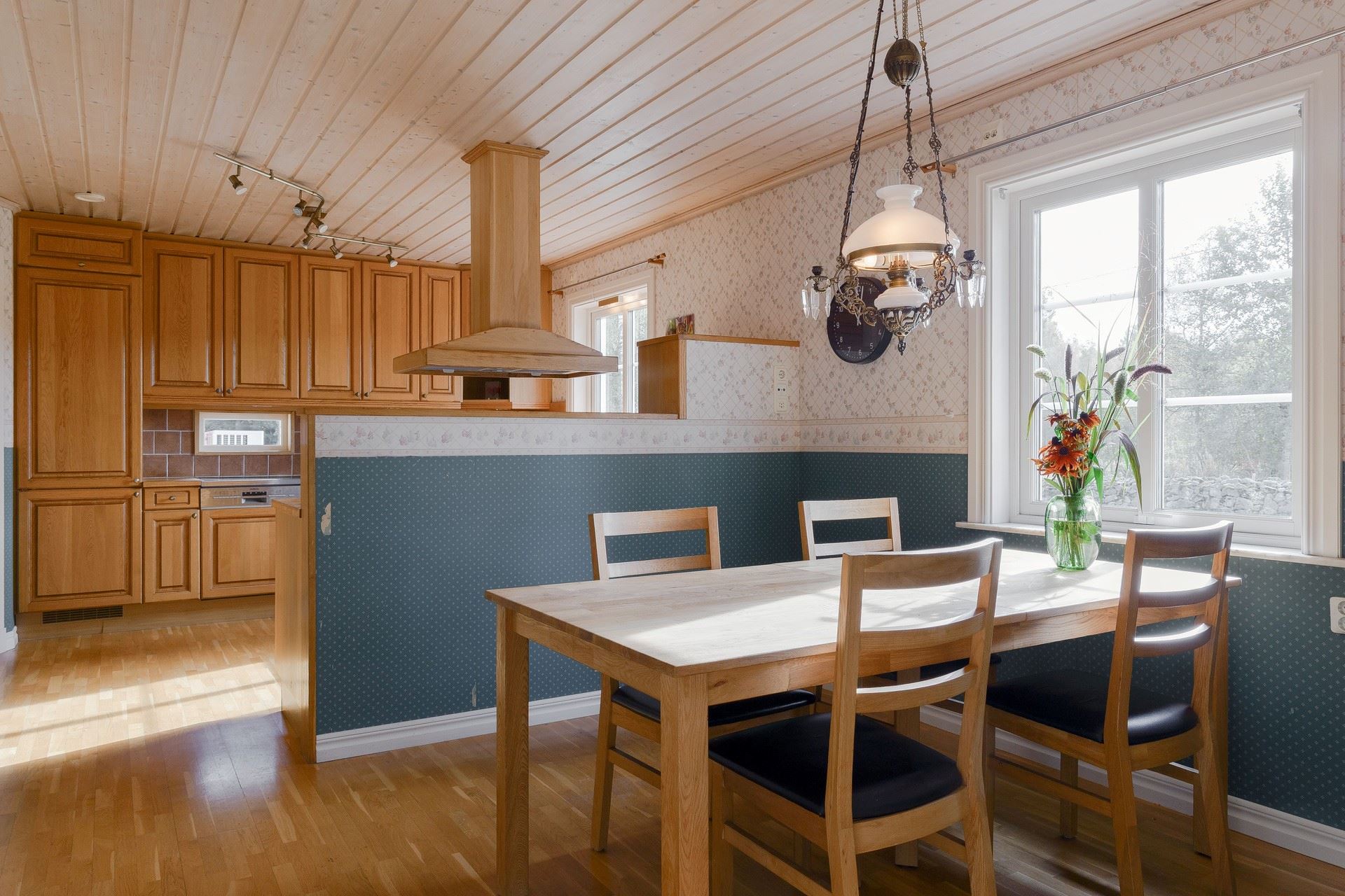 Direkt till höger från hallen når man husets kök och matplats. Här finns även en vacker äldre spis som kan generera både värme och goda middagar. Ekparkett med tapetserade väggar. Kökets luckor är i vacker patinerad ek och har fina detaljer. Massiv ek som bänkskiva, kakel satt som stänkskydd och en rejäl fläkt för den som älskar laga mat och för den inbitne matlagaren så är skafferiet oumbärlig förvaringskälla av alla torrvaror och hushållsmaskiner som kan behövas i ett kök. Flera fönsterpartier ger fint ljusinsläpp. Den maskinella utrustningen består av integrerad diskmaskin, spis med ugn, köksfläkt samt integrerad halv kyl och frys. Microvågsugn ingår ej.