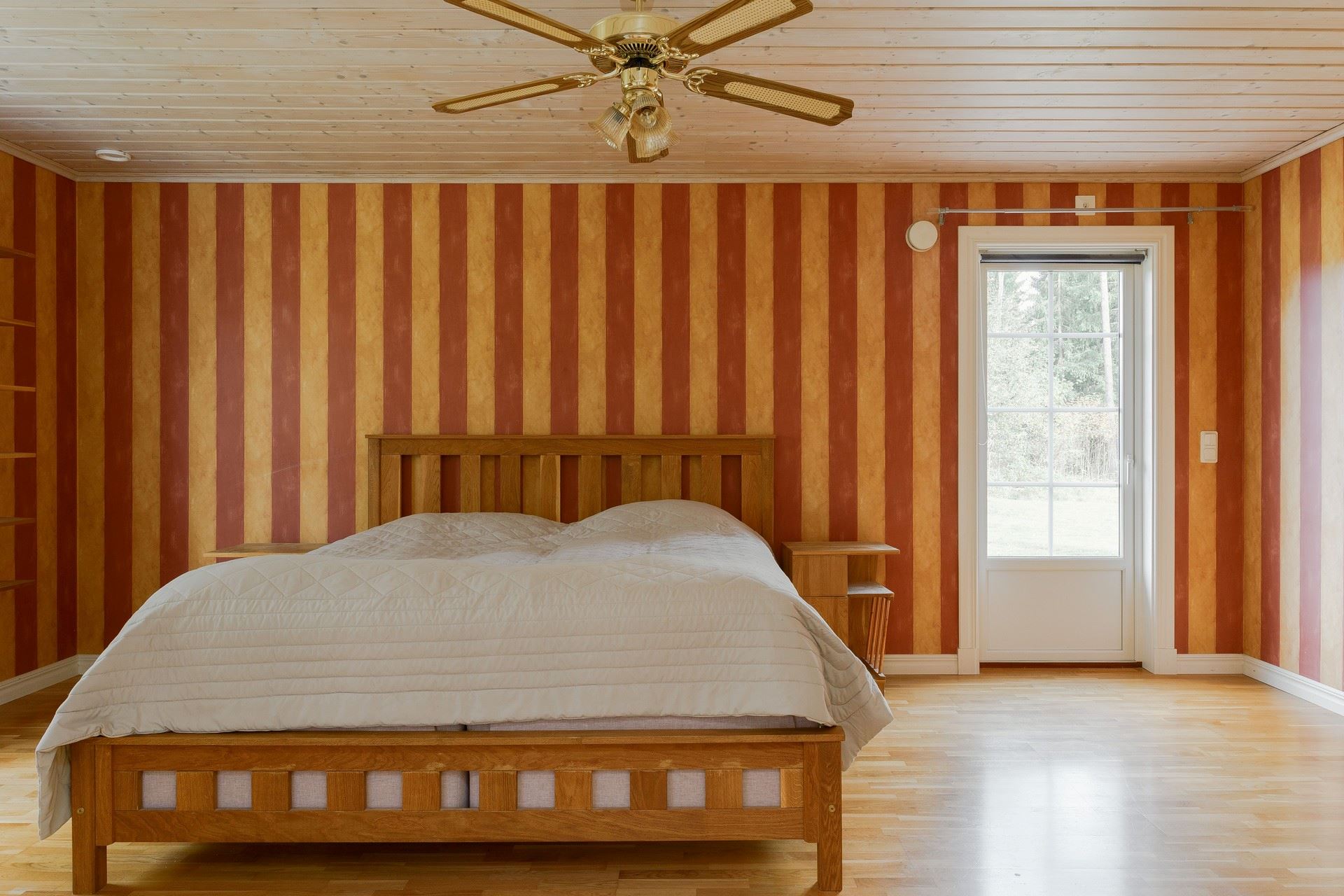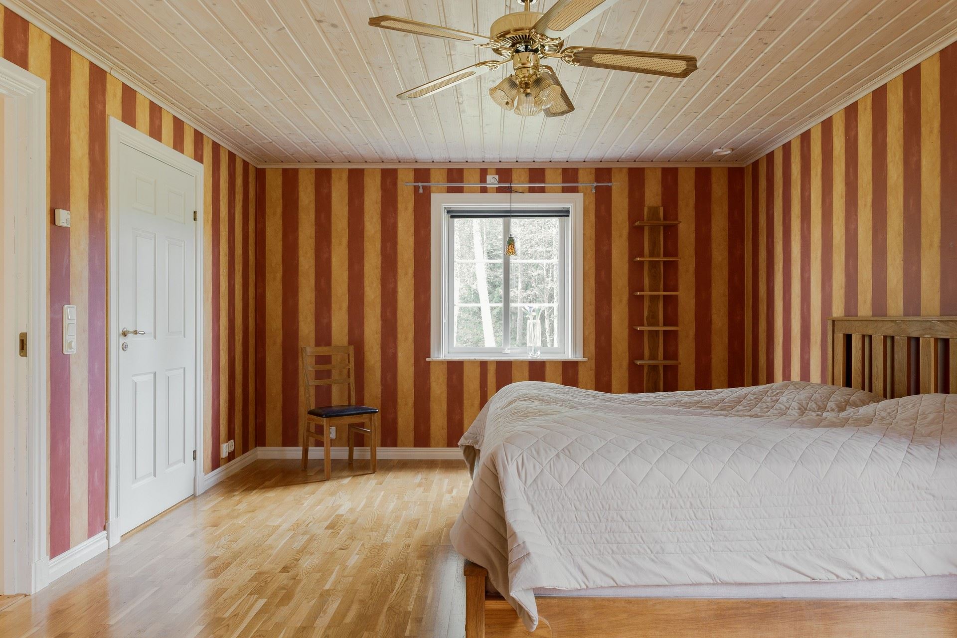 Stort sovrum med tapetserade väggar, ekparkett och där det finns gott om plats för dubbelsäng, sminkbord och ändå får man plats med en barnsäng när barnet är riktigt liten, om man så vill. Vill man använda rummet till ett sällskapsrum så finns det fönster och utgång till baksidan från rummet. Till rummet hör en stor klädkammare.