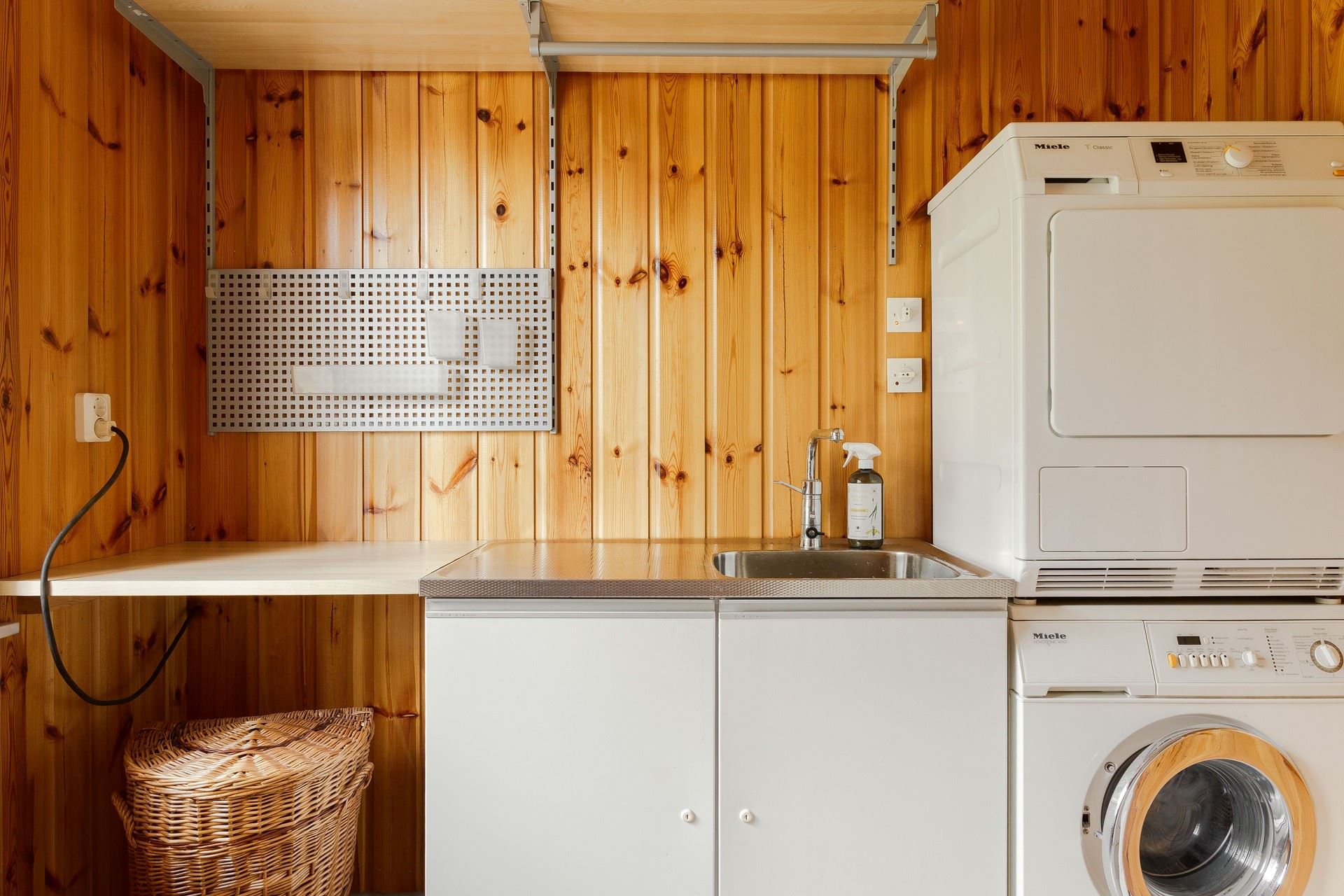 Från förstugan når man husets tvättavdelning. Här sköts tvättbestyren smidigt och enkelt. Utrustad med praktisk bänk med diskho samt en tvättpelare bestående av tvättmaskin och torktumlare från Mile. Det finns också torkställningar som man lätt kan fälla ut och in från väggen så de tar minimalt med plats när man inte använder dem.