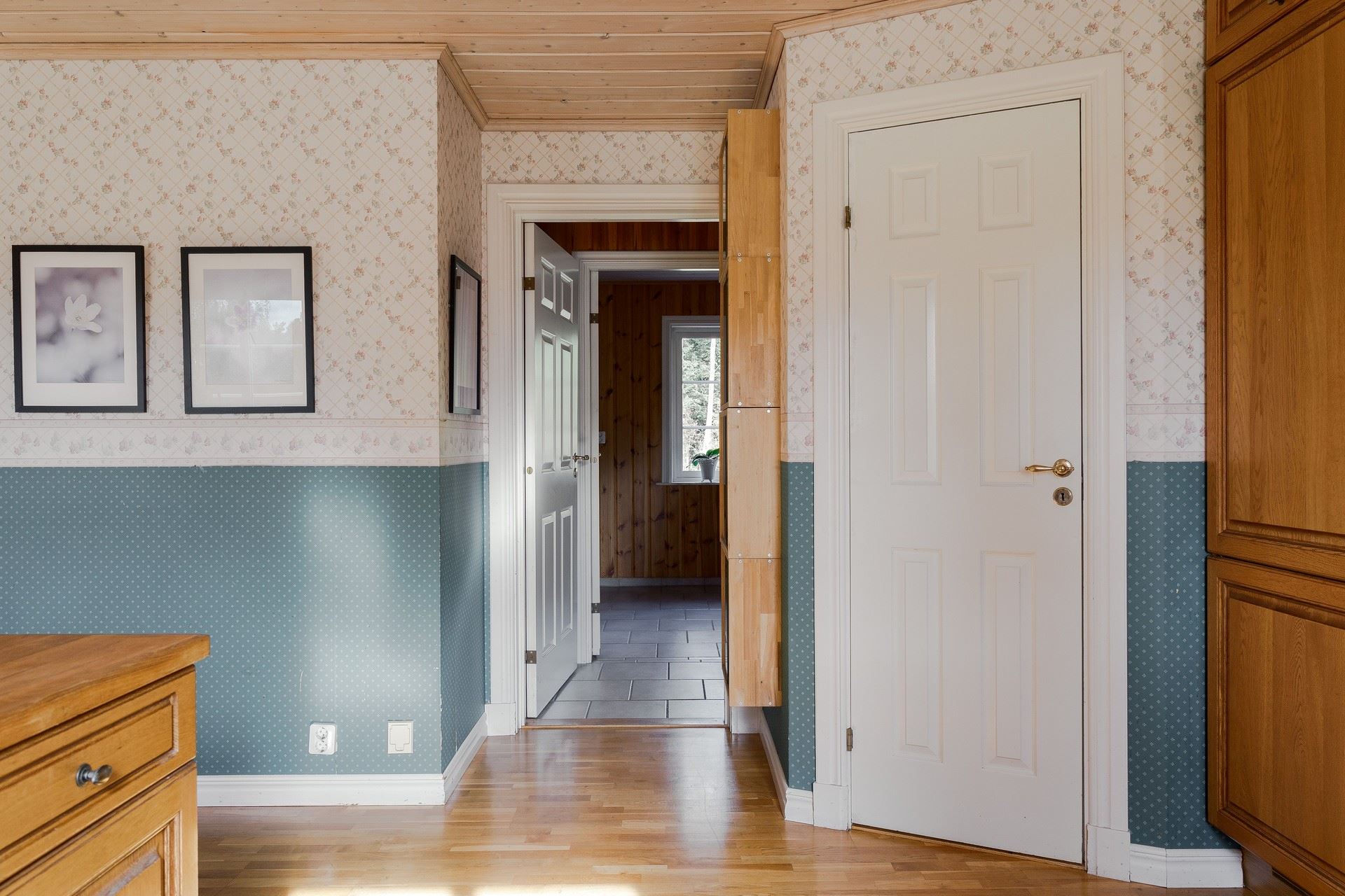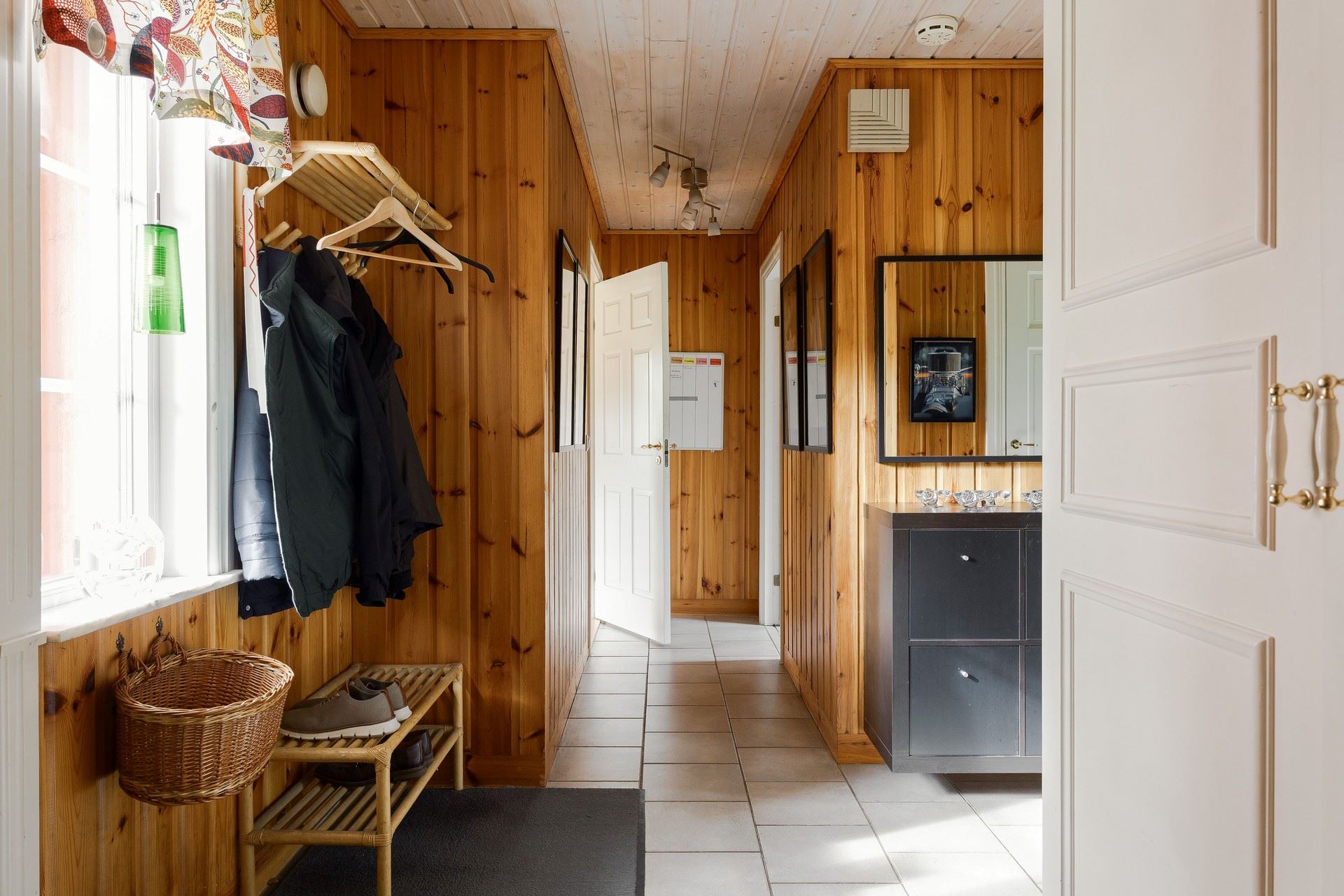 Från köket når man den andra ingången till huset och som ger gott om plats för avhängning av ytterkläder och skor. Klinker på golv med träpanelväggar. Härifrån når du smidigt gäst-wc, tvättavdelning samt garagen.