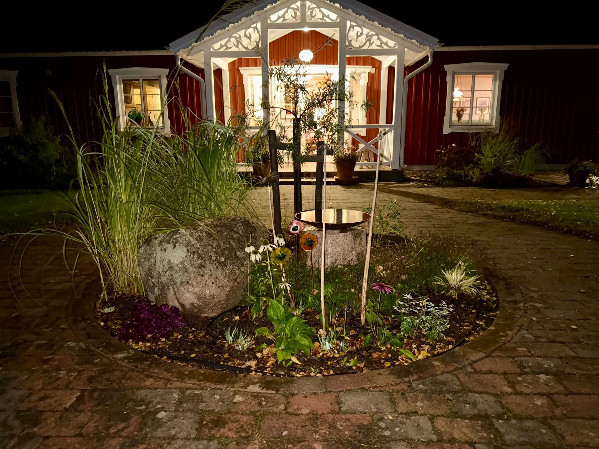 Här kan barnen leka fritt och tryggt, samtidigt som man har ett riktigt paradis att förverkliga dina odlingsdrömmar i. Söder- och norrläge. Trädgården är både välskött och inspirerande, med vackra planteringar, bärbuskar, blomsterprakt och goda möjligheter till vidare odling. Med ett redan installerat bevattningssystem blir det enkelt att hålla grönskan frodig även under varma sommardagar.