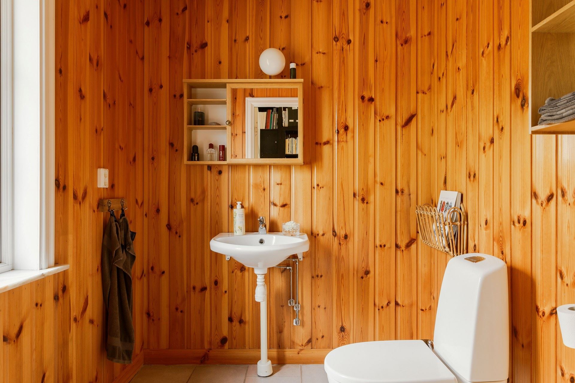 Rymlig gäst-wc utrustad med klinker på golv och träpanelväggar, vidare finns här ett handfat, badrumsskåp och wc. Fönster för vädringsmöjlighet och naturligt ljusinsläpp. Ny toalettstol 2025.