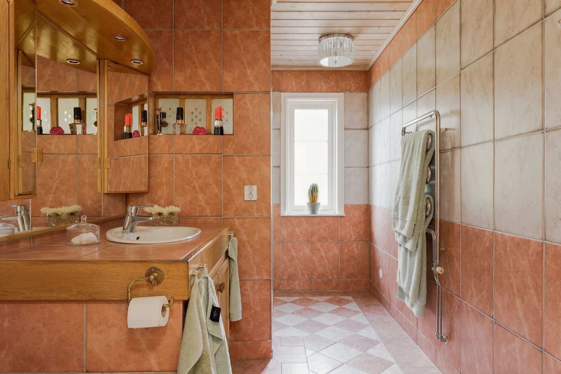 Helkaklat badrum med skön golvvärme. Utrustad med en rymlig dusch, badrumsskåp med belysning och handfat med skåpsförvaring under. Fönster för vädringsmöjlighet och naturligt ljusinsläpp.