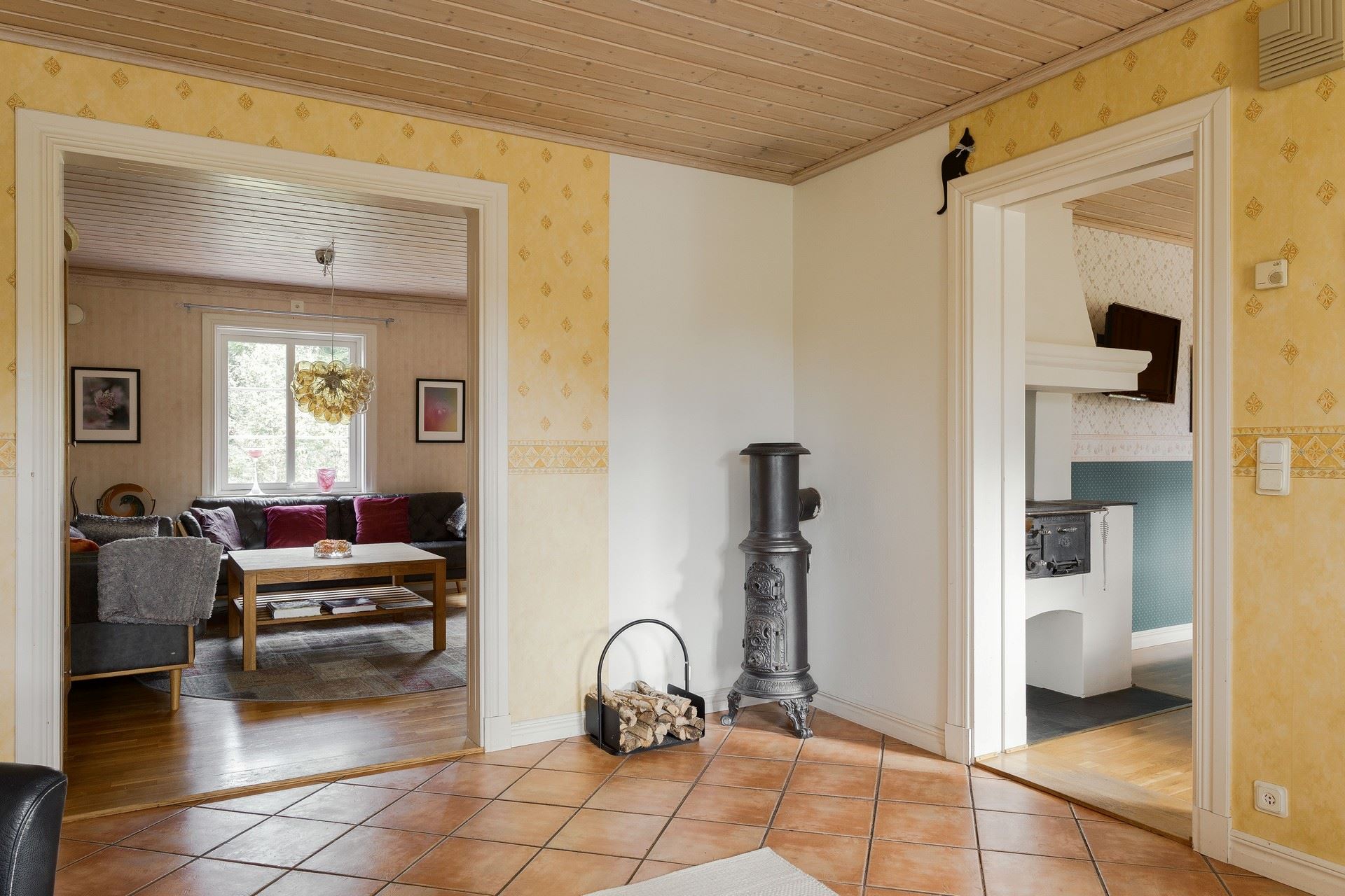 Via den vackra verandan som andas 1800-tal när snickarglädjen hade sin stora period av yrkesskicklighet, når man husets entré. Rymlig och pampig hall som medger plats för avhängning av ytterkläder samt även andra möbleringsalternativ. Hallen är också navet i huset då man når de olika avdelningar på ett centralt vis. Tapetserade väggar med klinkergolv och takpanel i trä. Det finns även en vedkamin i hallen om man vill höja mysfaktorn i hallen. Genomgående i hela huset är det skön golvvärme till och med i garaget.