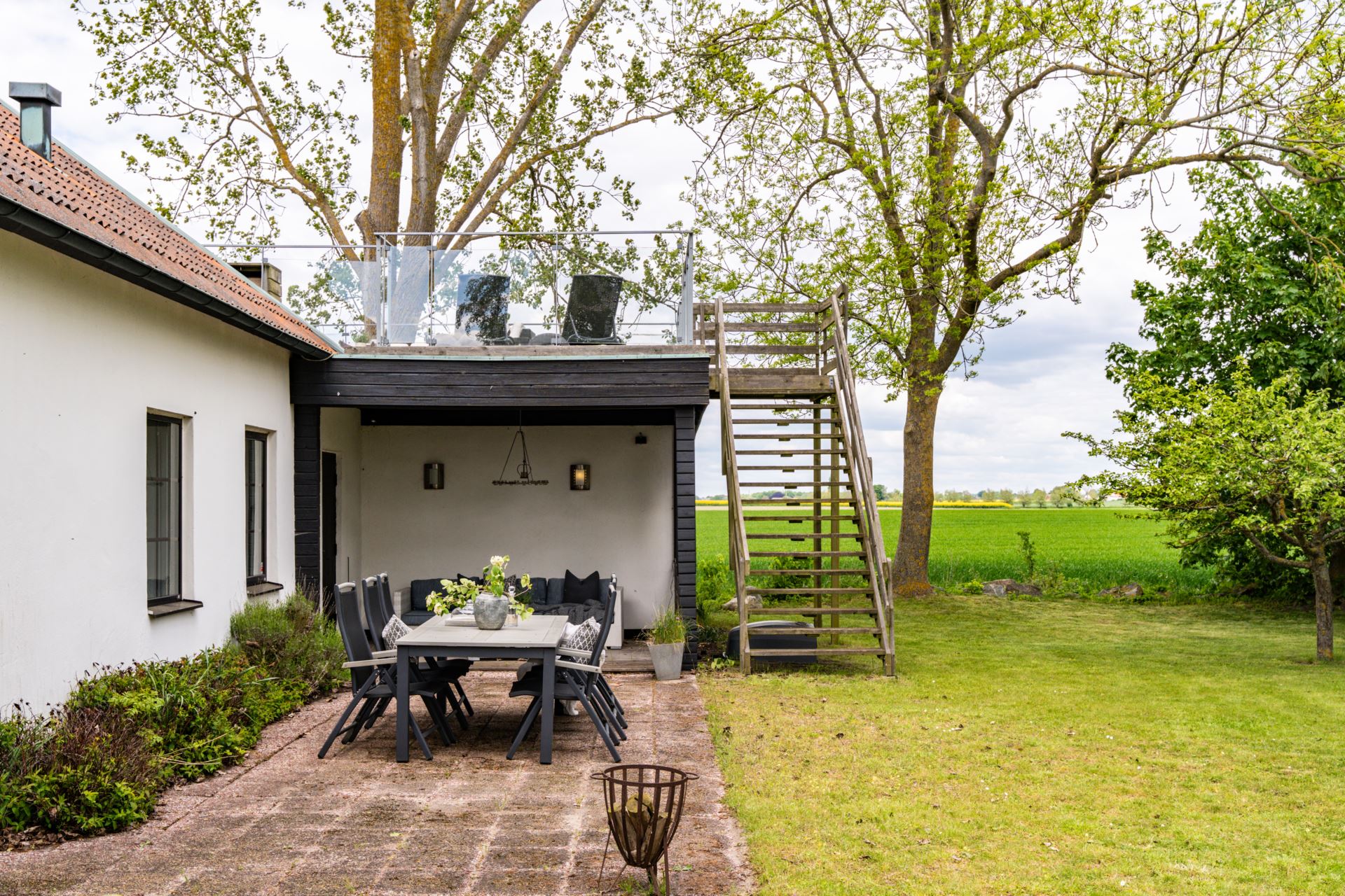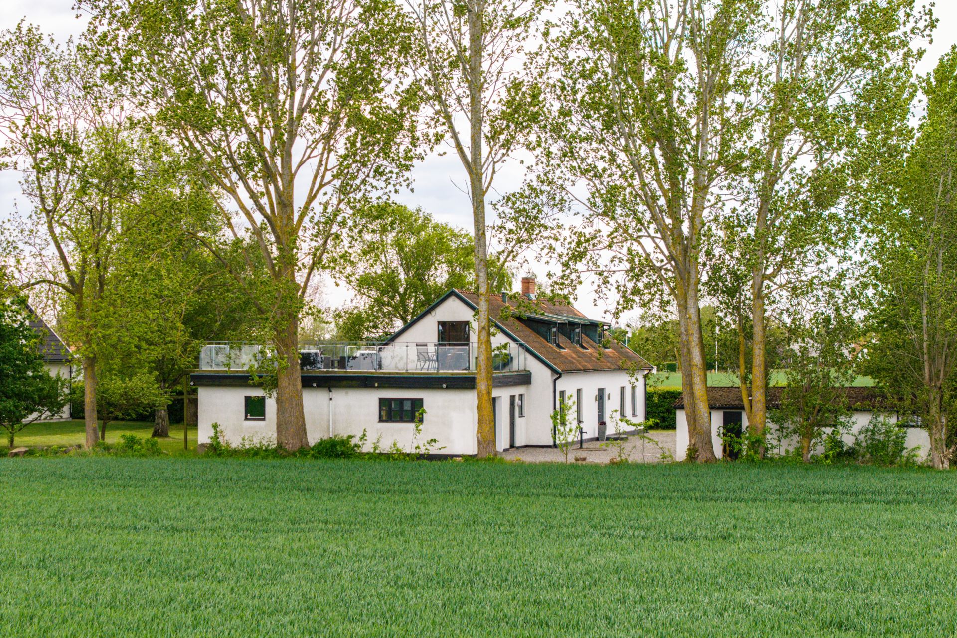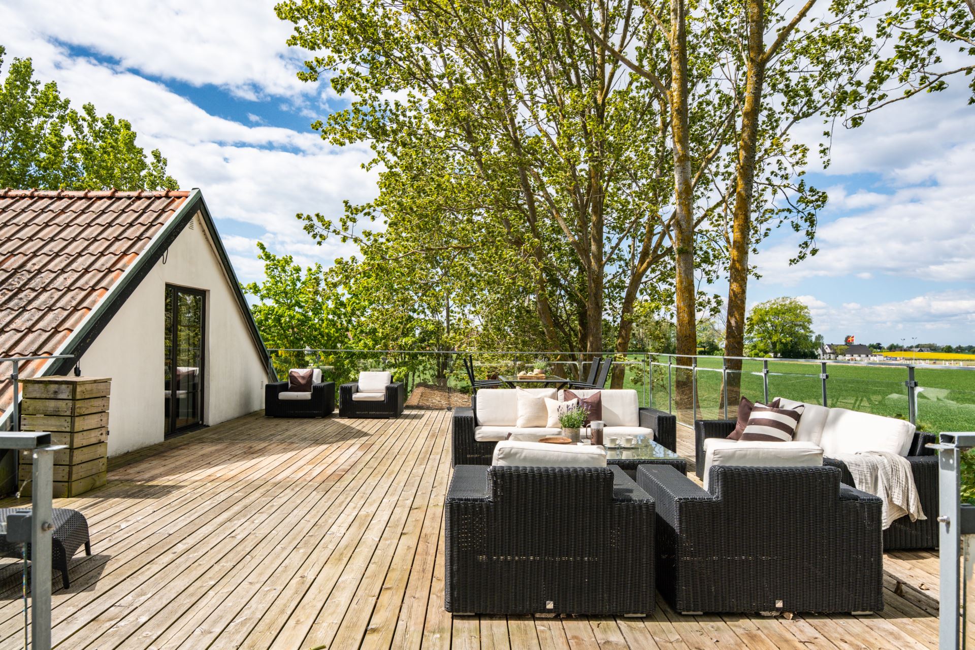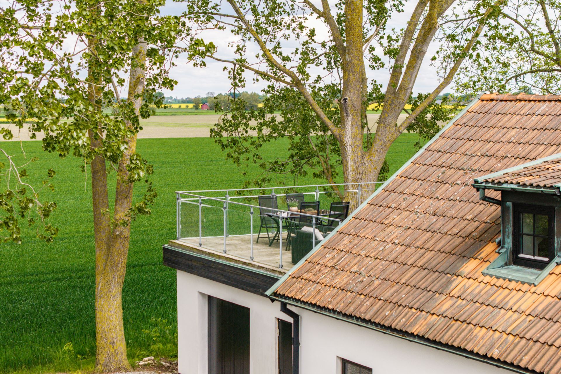 Takterrass belägen en trappa upp med utsikt över det omgivande landskapet. Terrassen har gott om plats för både sittgrupp och matmöblemang. Ett glasräcke löper längs kanten och ger fri sikt mot fälten. Direkt utgång från sovrummet ger enkel åtkomst.