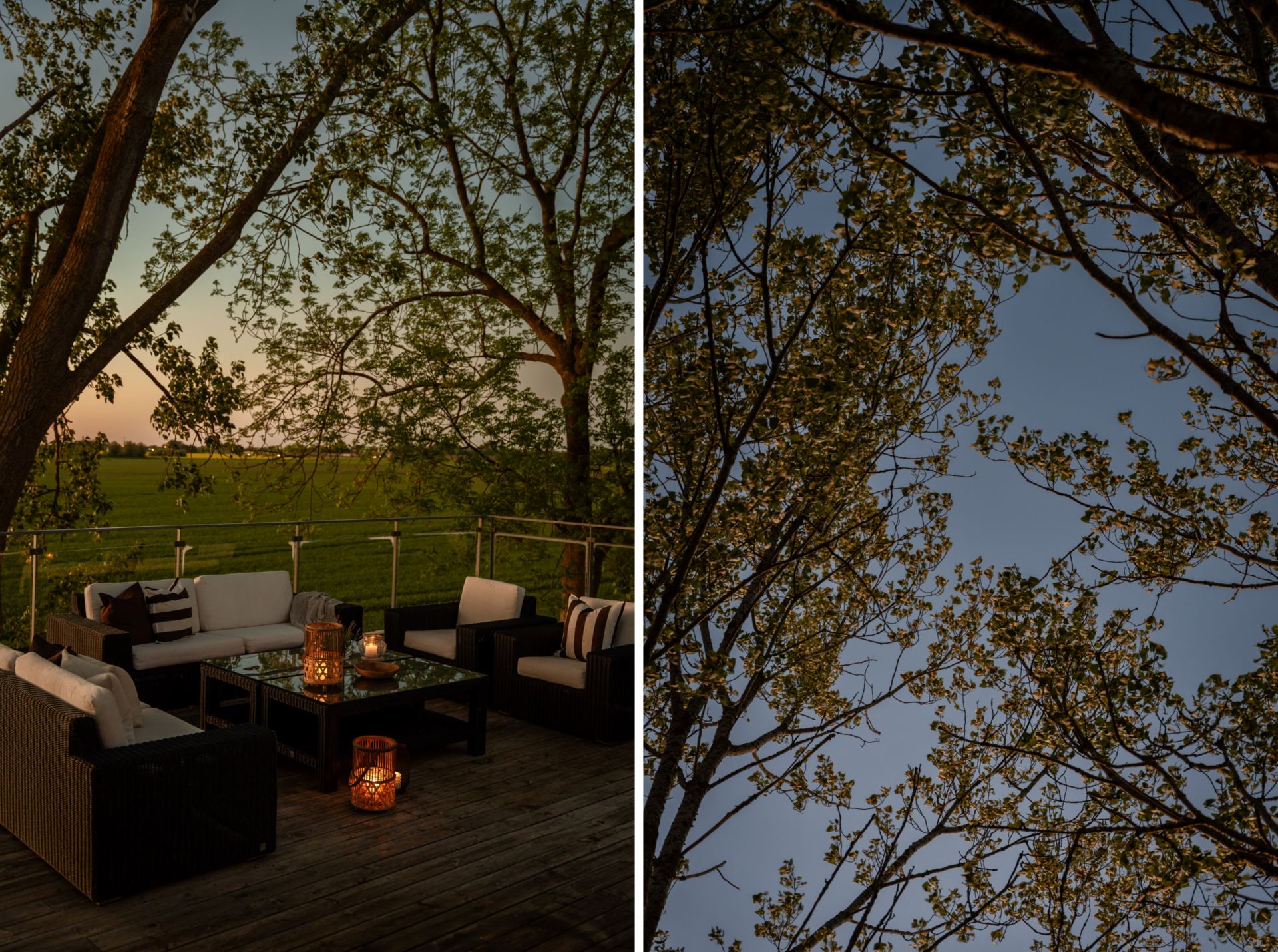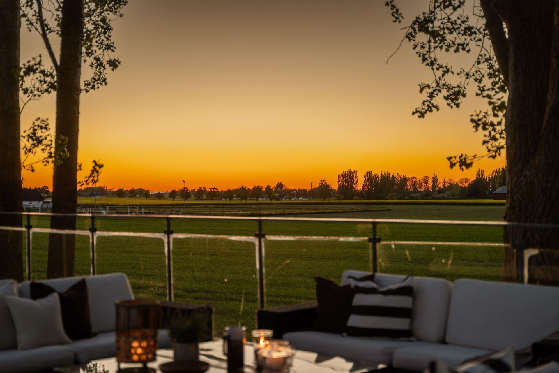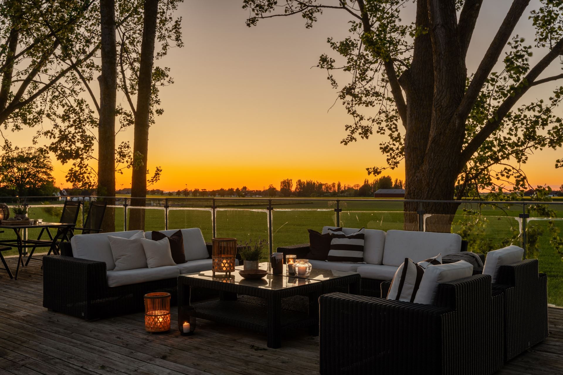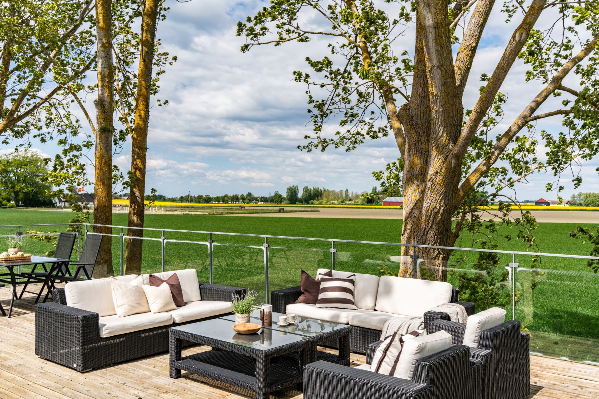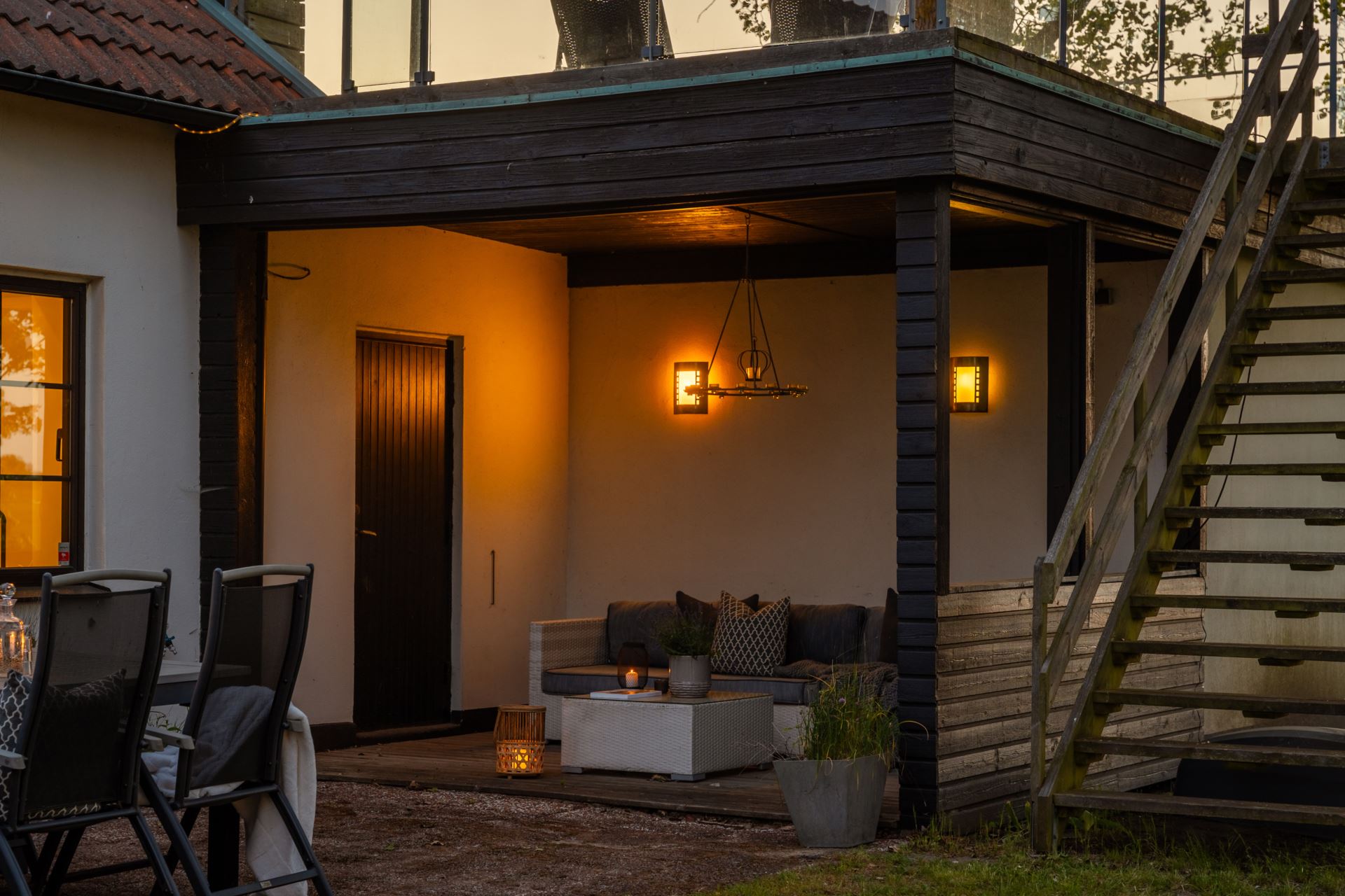 Takterrass belägen en trappa upp med utsikt över det omgivande landskapet. Terrassen har gott om plats för både sittgrupp och matmöblemang. Ett glasräcke löper längs kanten och ger fri sikt mot fälten. Direkt utgång från sovrummet ger enkel åtkomst.