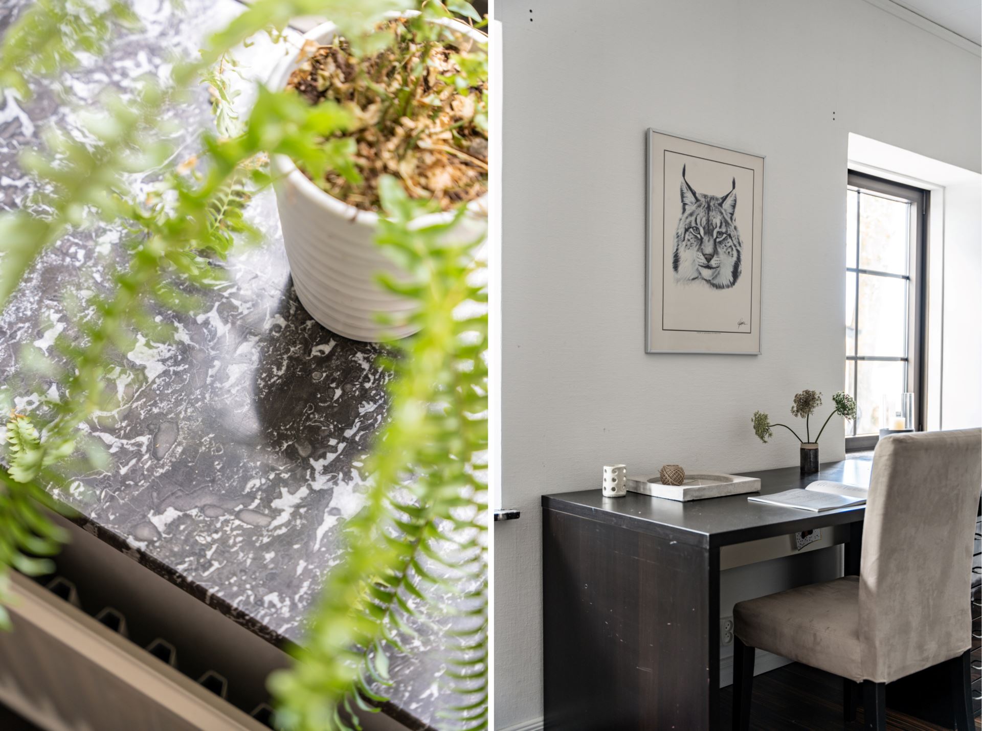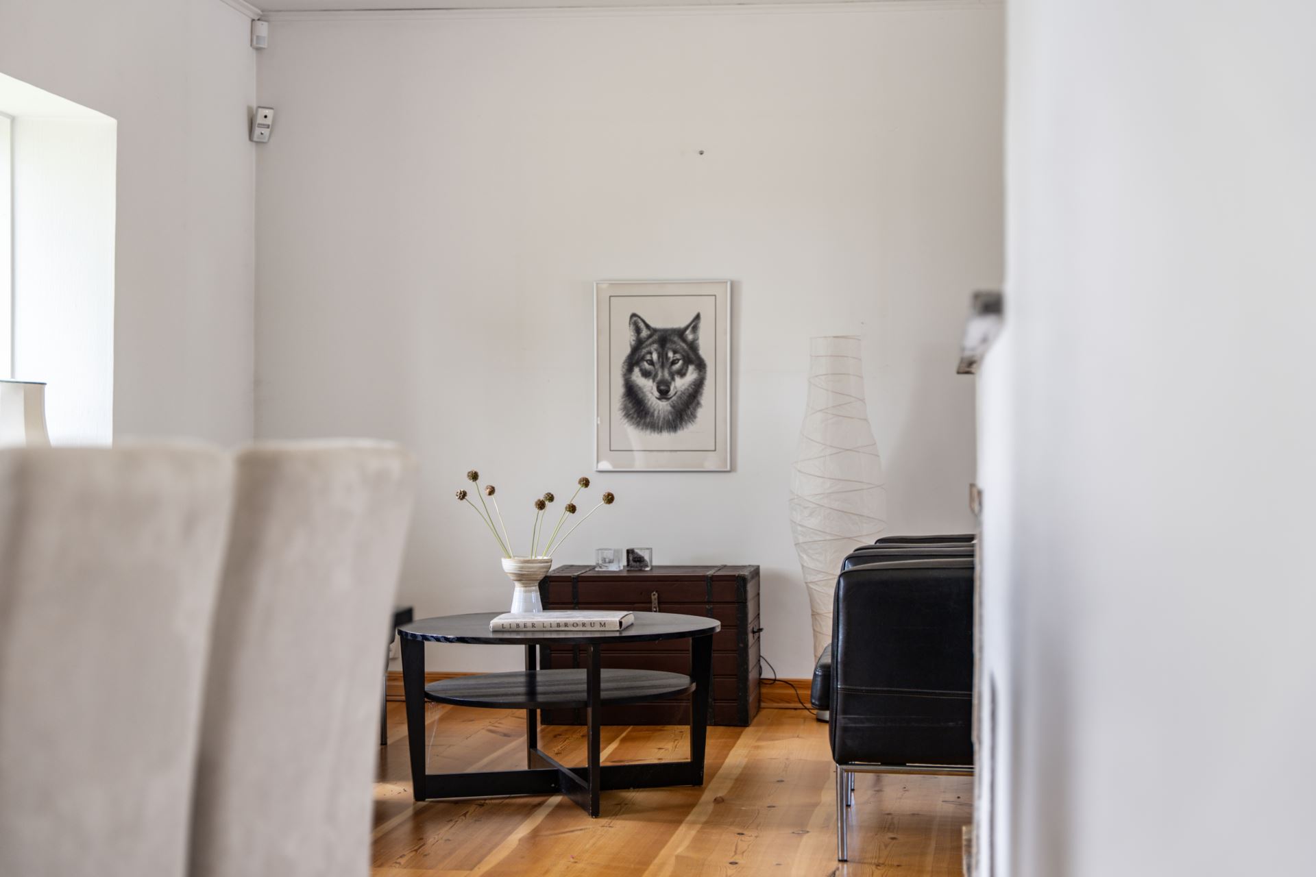 Matplatsen är ljus med stora fönster som släpper in gott om dagsljus. Trägolvet ger en mjuk kontrast till de ljusa väggarna och bidrar till en varm känsla i rummet.