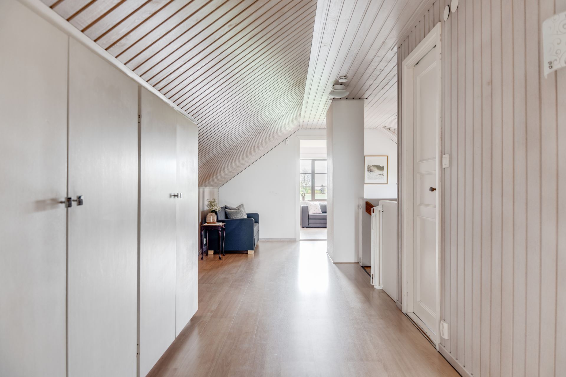 Vardagsrum på övre plan med ljusa ytskikt. Rummet har inbyggd förvaring i form av garderober längs ena väggen och kan användas som exempelvis sällskapsyta, kontor eller lekhörna. Det finns plats för både sittgrupp och skrivbord.