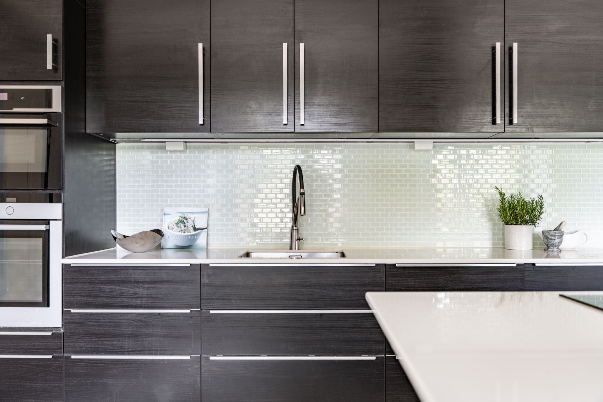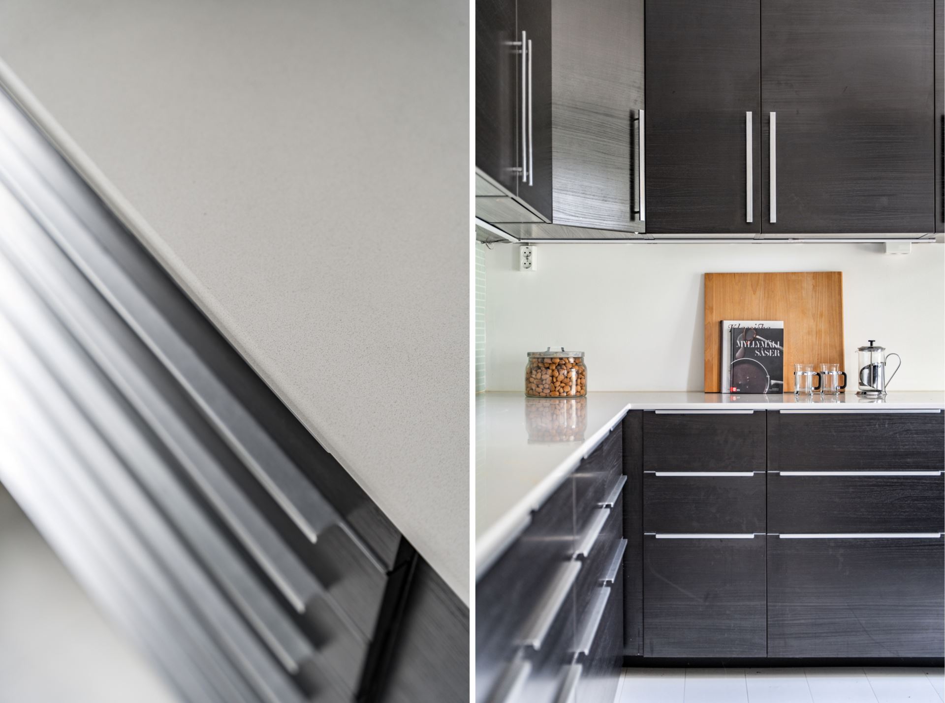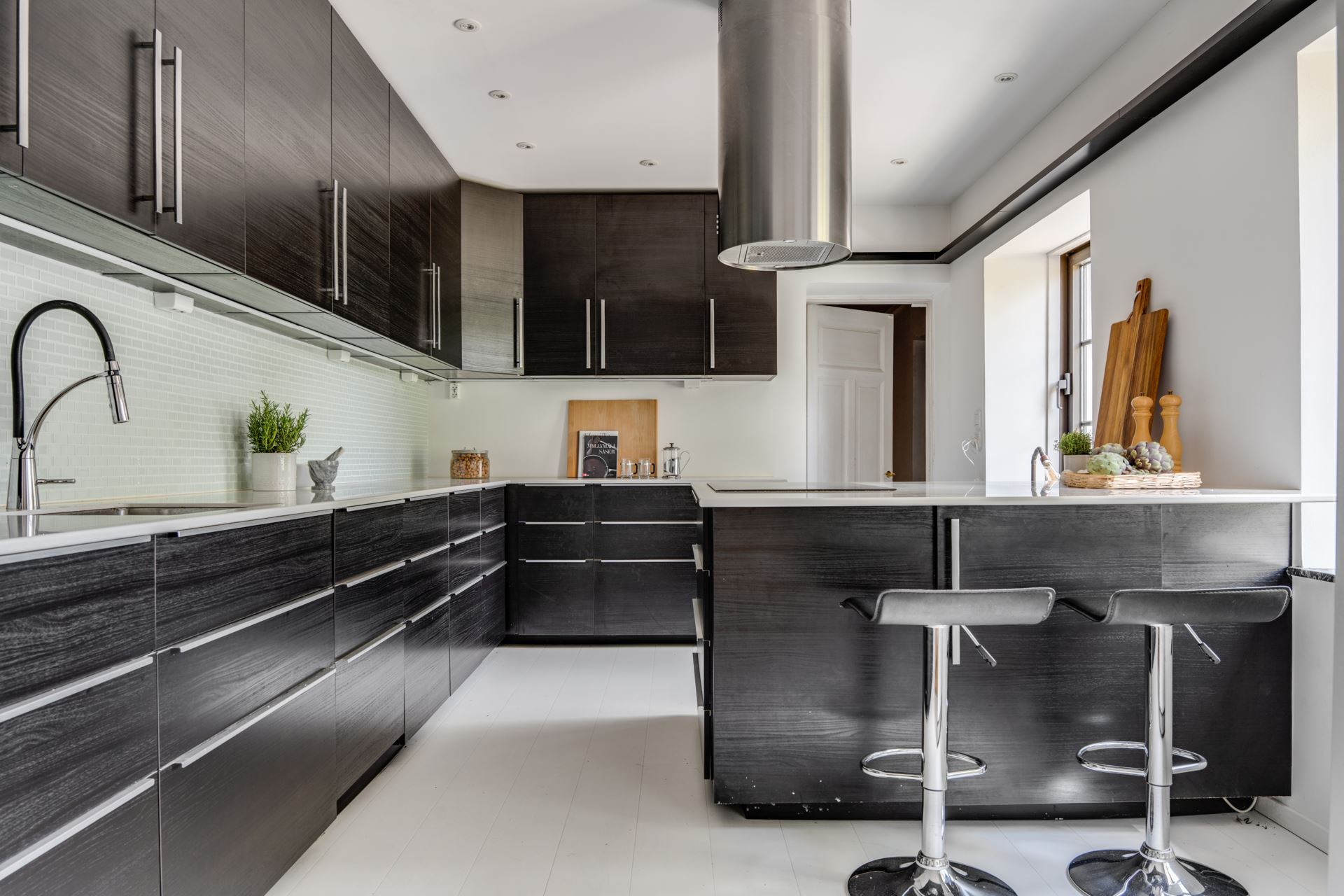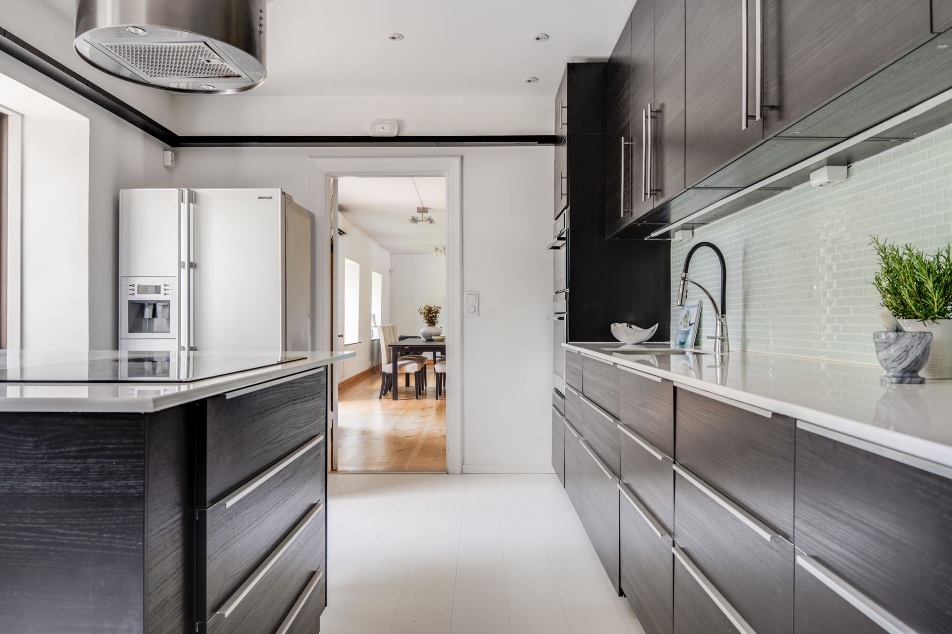 Köket renoverades 2014 och är planerat i vinkel med goda förvaringsmöjligheter bakom mörka skåpsluckor med långa beslag. Bänkskivorna är i ljus kvartssten och kompletteras av ett stänkskydd i glasmosaik.