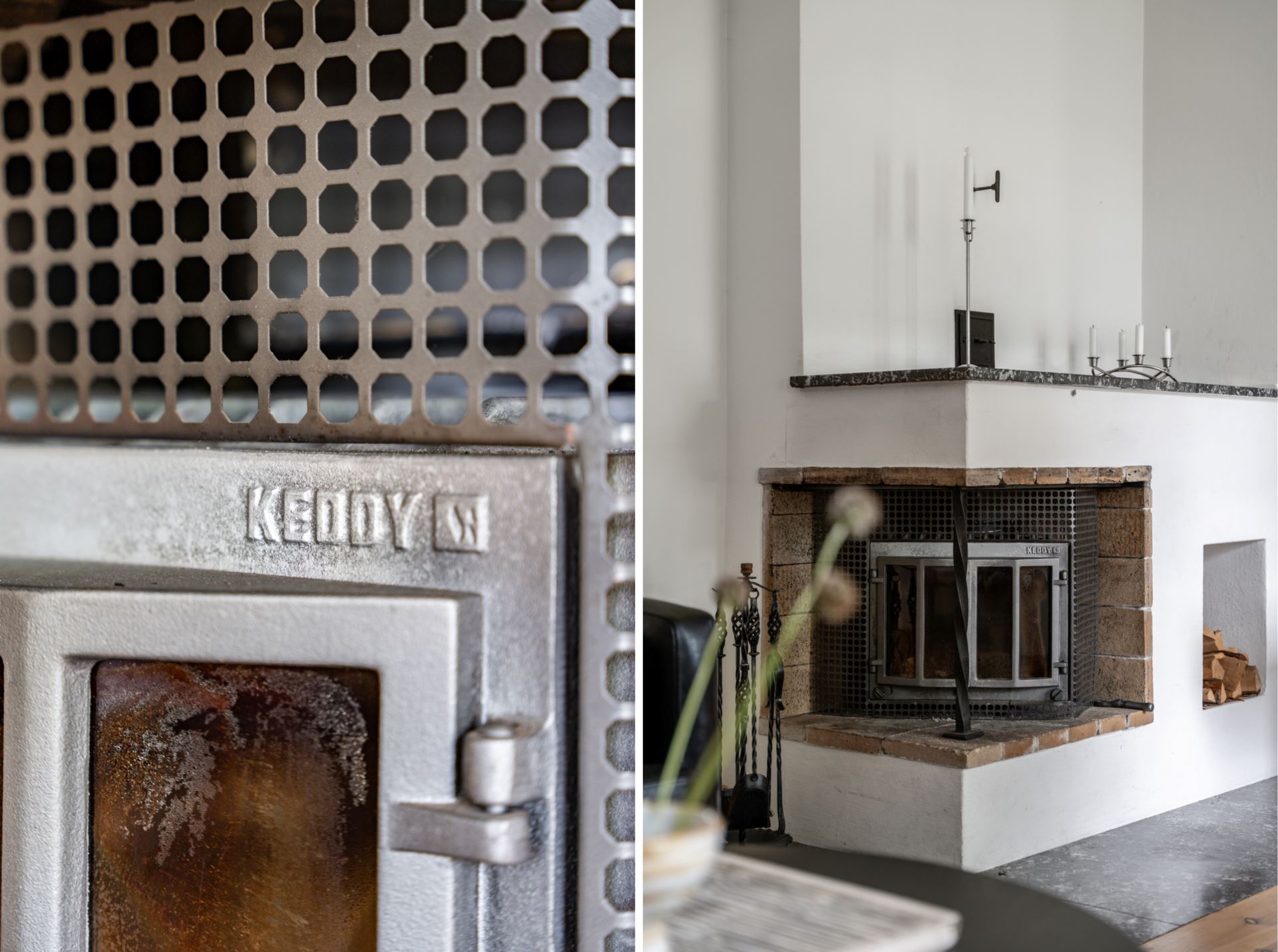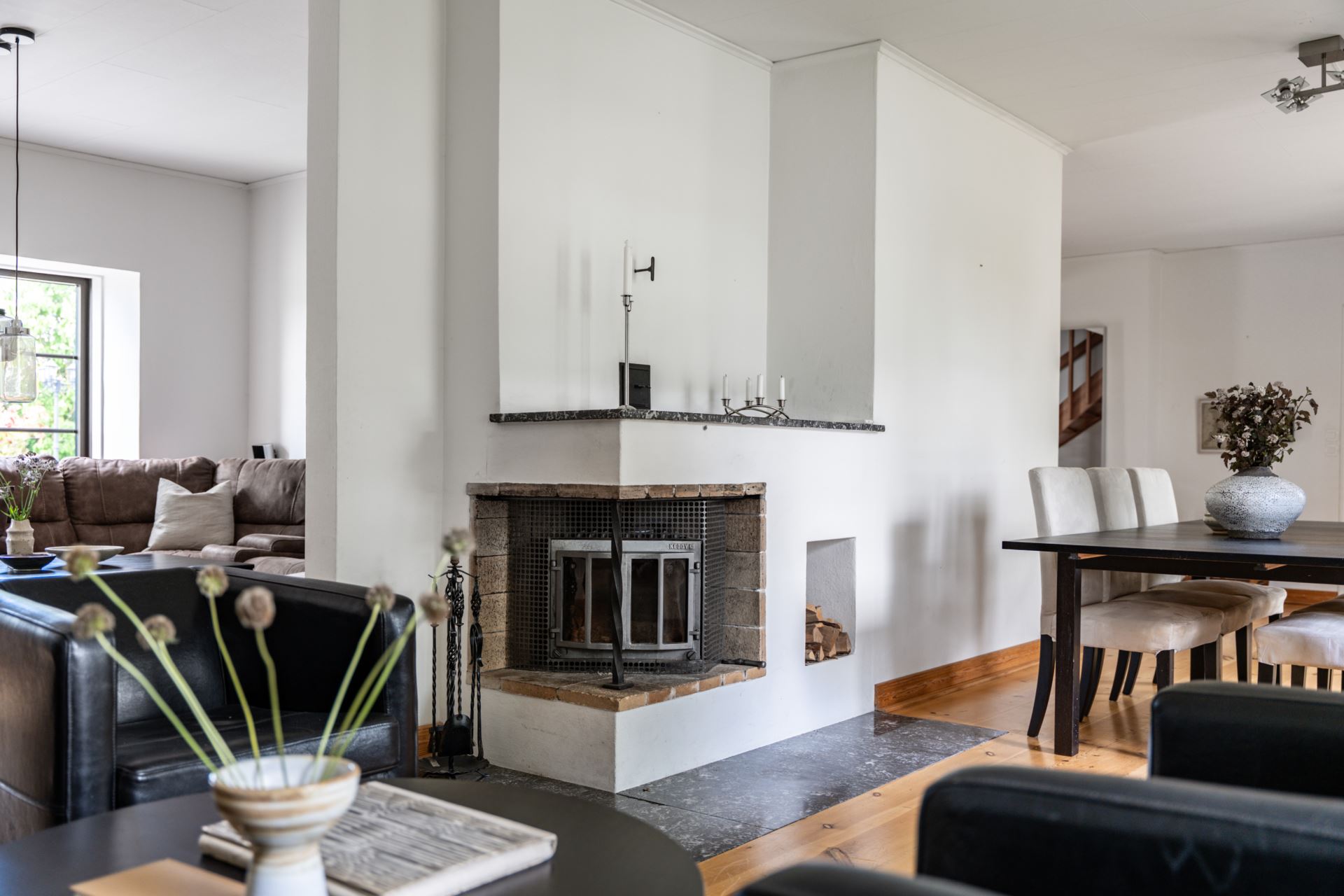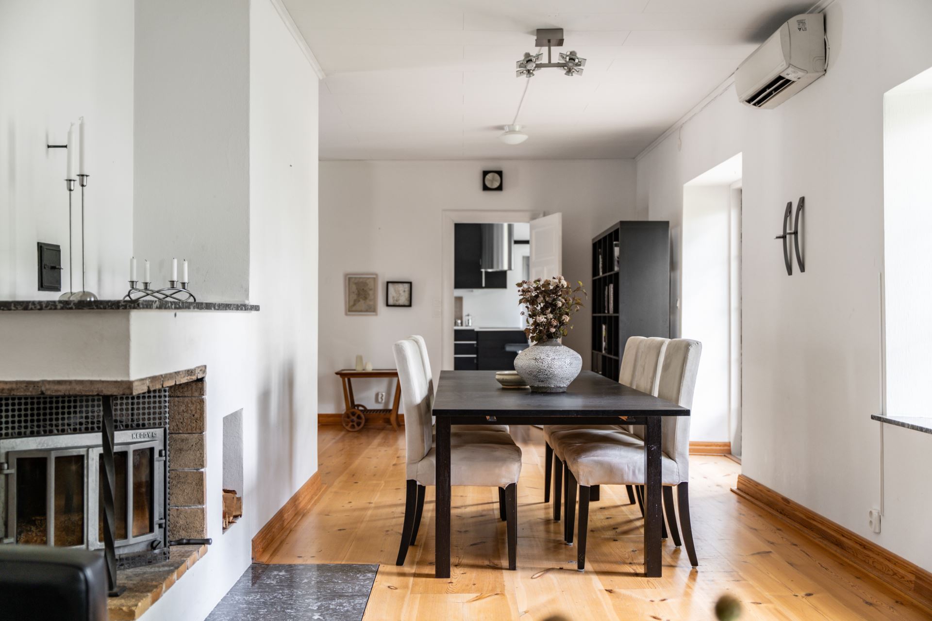 Det finns plats för ett större matbord, vilket gör rummet lämpligt för både vardag och samlingar. En öppen spis är centralt placerad mellan matplats och vardagsrum och fungerar både som värmekälla och rumsavdelare.