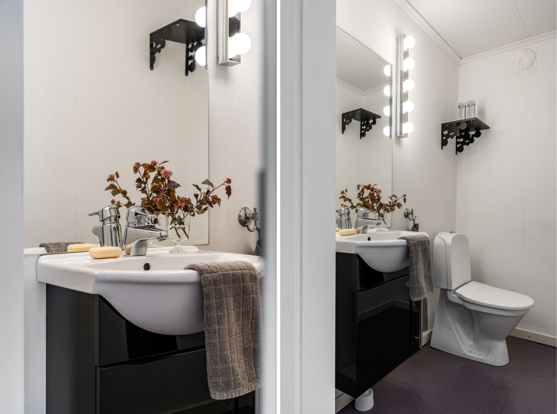 Gäst-wc med vitmålade väggar och ett mörkt golv. Rummet är utrustat med toalett och handfat med kommod i svart utförande. Ovanför handfatet finns en spegel med väggmonterad belysning. Öppen hyllförvaring finns monterad på väggen.