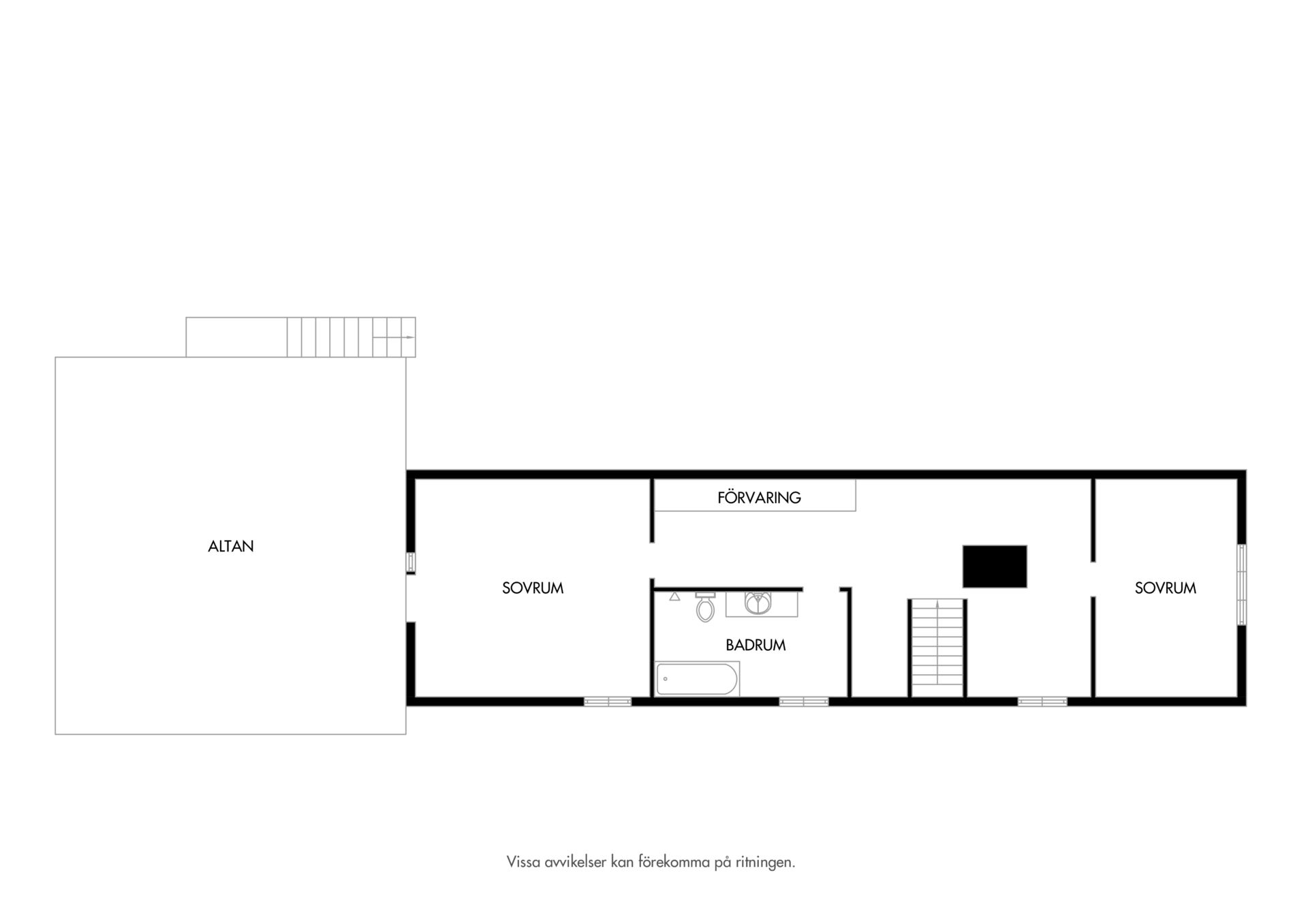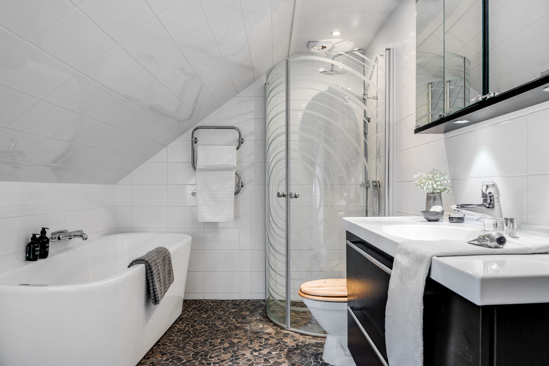 Badrum renoverat 2011 med helkaklade väggar i vitt och golv i natursten med elburen golvvärme. Rummet är utrustat med duschhörna med svängda glasdörrar samt ett fristående badkar.