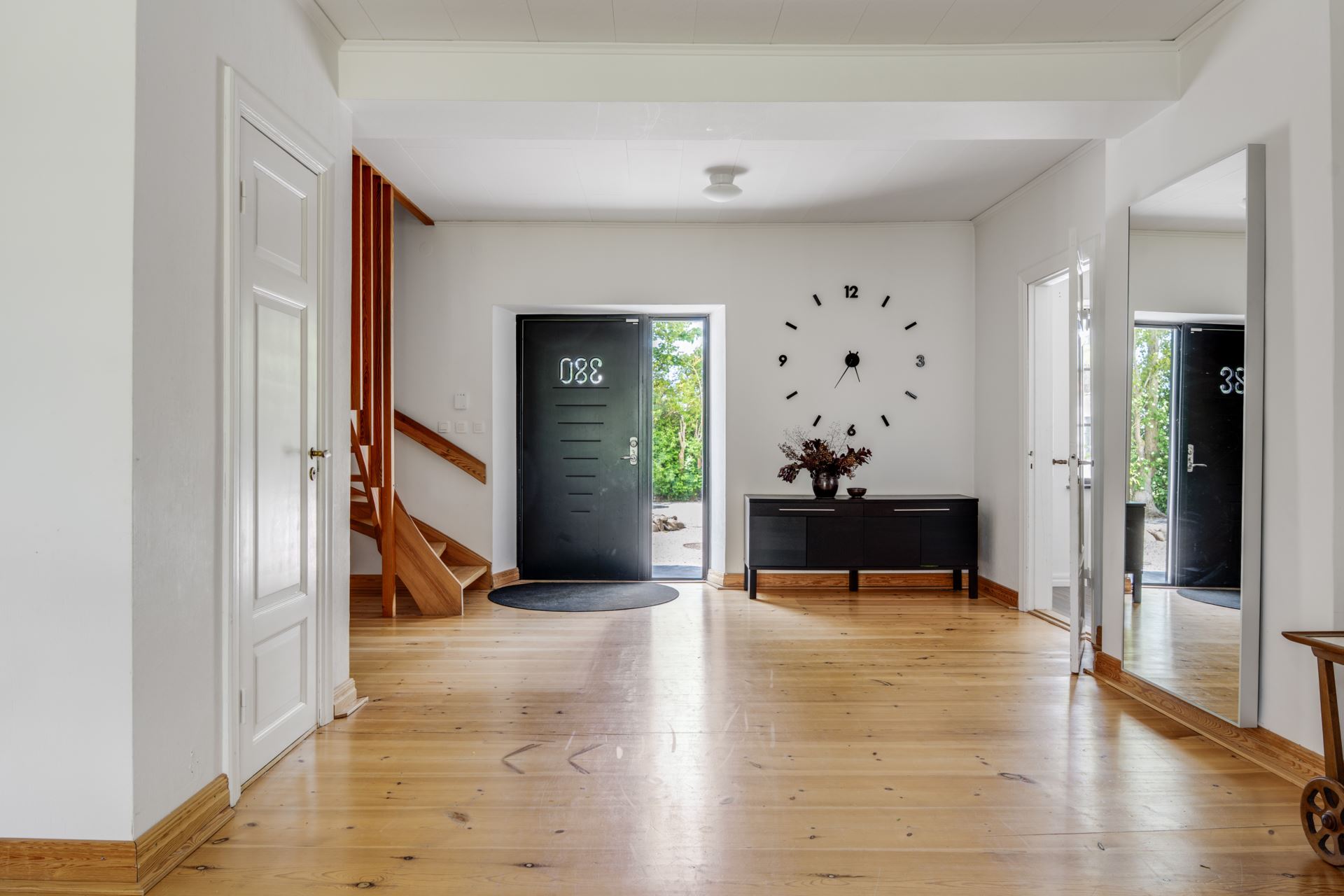 Entrén är rymlig med gott om ljusinsläpp från dörrpartier och fönster. Golvet är i trä och väggarna är målade i vitt.
