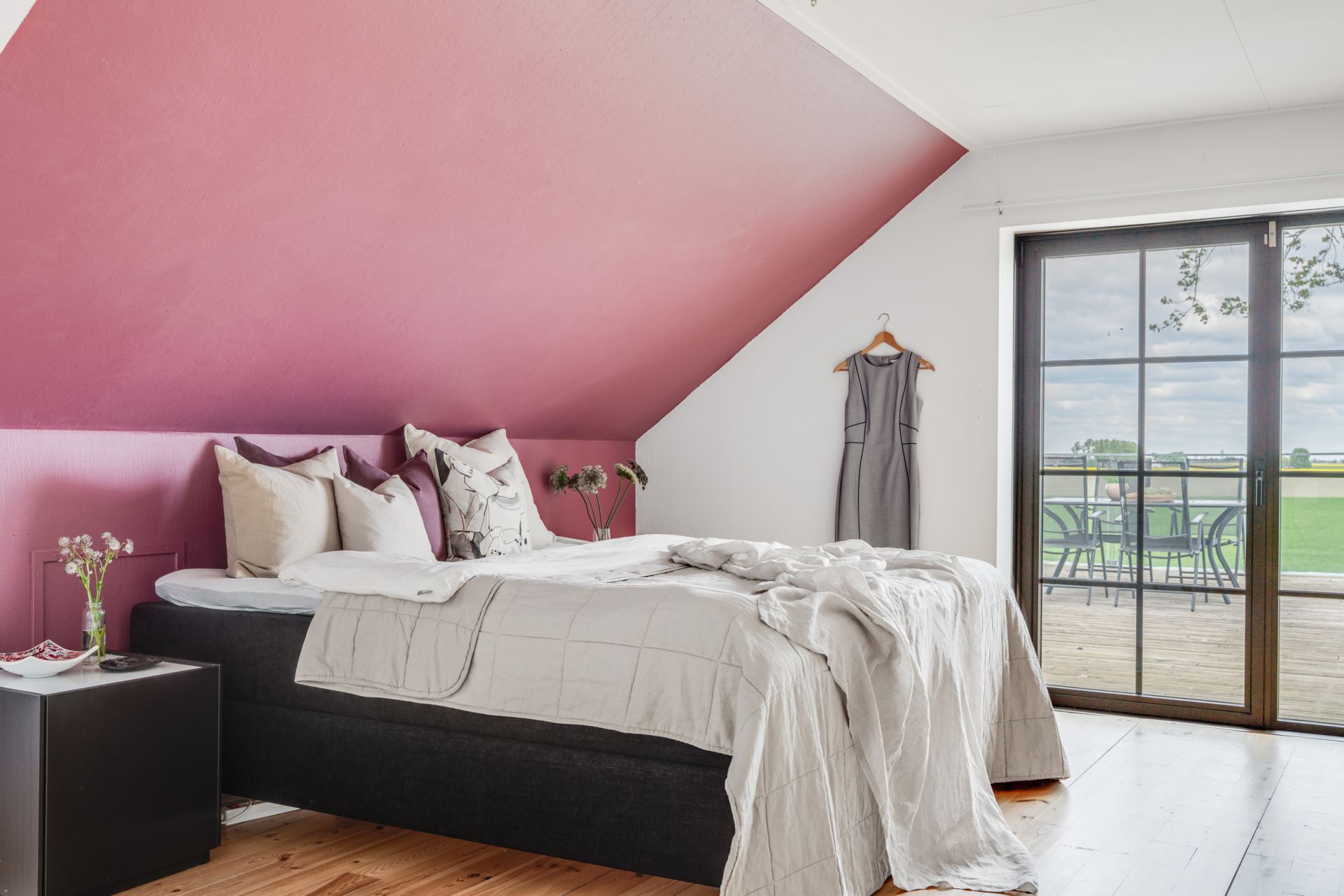 Detta sovrum har trägolv samt målade väggar. Rummet rymmer dubbelsäng och har gott om plats för förvaring eller mindre möblering. Stort öppningsbart glasparti leder ut till takterrass med utsikt över öppet landskap. Ljusinsläppet är generöst och ger rummet en ljus och öppen känsla.