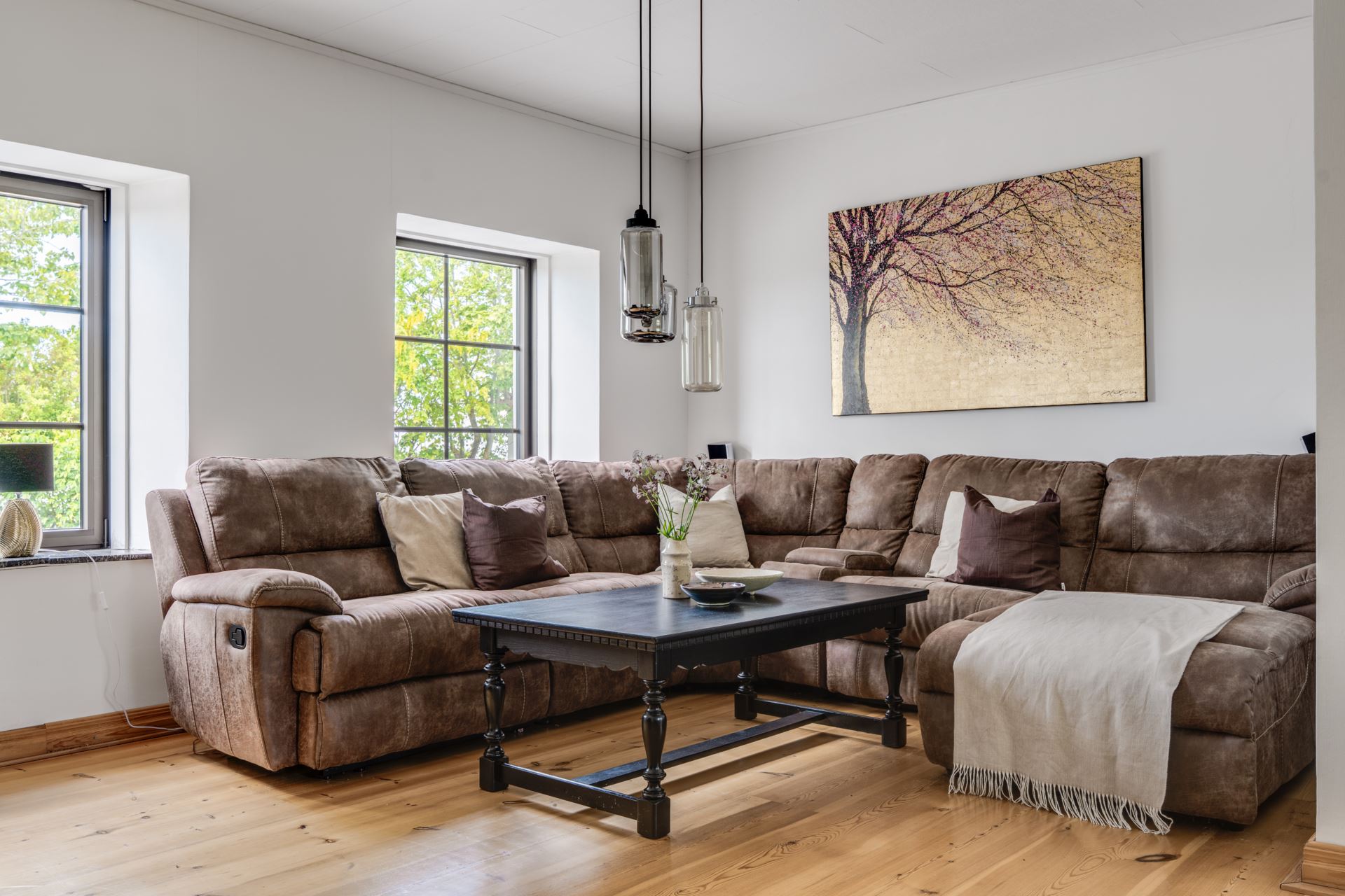 Stora fönsterpartier ger ett bra ljusinsläpp och vetter mot grönskan utanför. Rummet rymmer både en större soffgrupp och en separat sittdel.