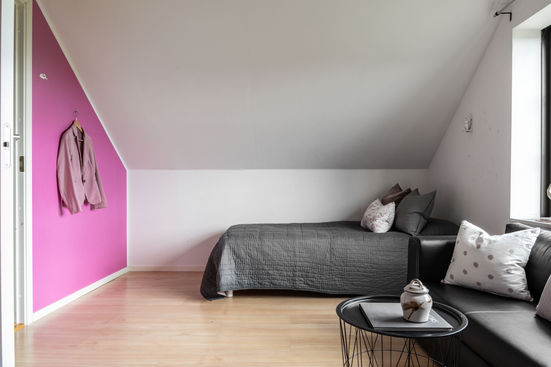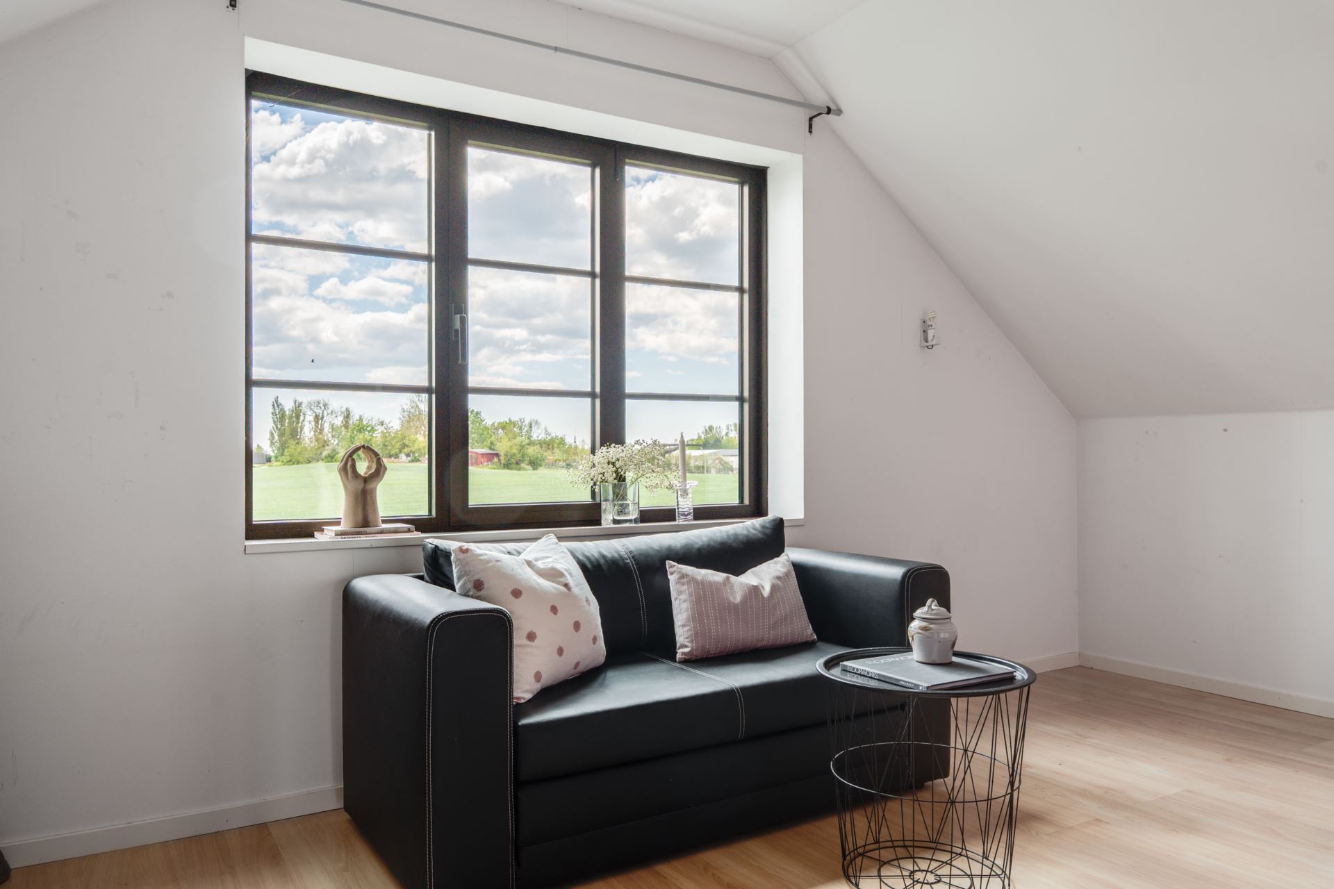 Sovrummet med ljusa väggar och ett större fönsterparti som ger gott om dagsljus och utsikt mot omgivande grönområde. Golvet är i laminat och målade väggar. Rummet rymmer säng, soffa eller skrivbord och kan anpassas efter behov, exempelvis som sovrum eller gästrum.