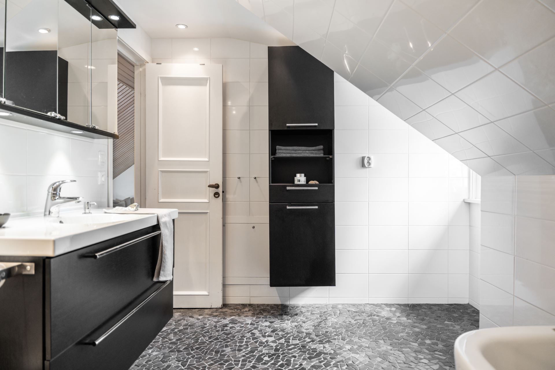 Tvättställ med underskåp och spegelskåp ger förvaringsmöjligheter, kompletterat av ett högskåp. Badrummet har ett fönster som bidrar till ljusinsläpp. Elektrisk handdukstork är installerad.