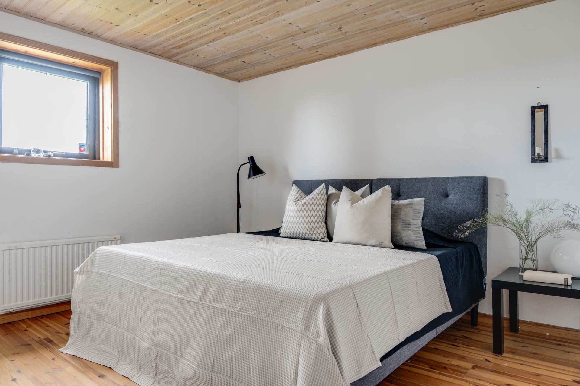 Sovrum med vitmålade väggar, laminatgolv samt att tak klätt i träpanel. Ett högt placerat fönster släpper in dagsljus samtidigt som insynen begränsas. Rummet har plats för en dubbelsäng och är möblerat i en enkel och funktionell stil.