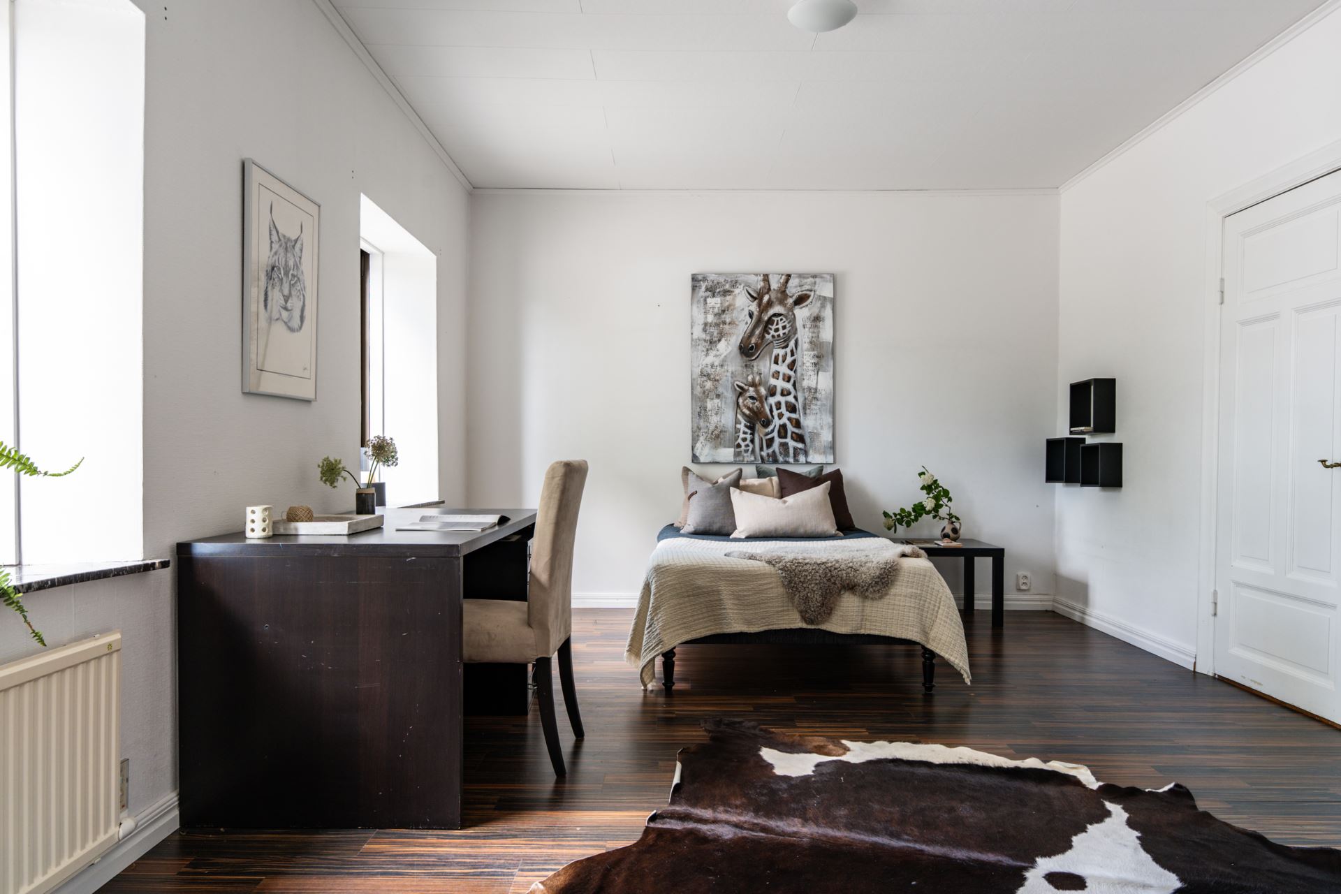 Sovrum med vitmålade väggar och mörkt laminatgolv. Rummet har två fönster som ger ett bra ljusinsläpp. Det finns plats för både säng och skrivbord, vilket gör det möjligt att kombinera sovplats med arbetsyta.